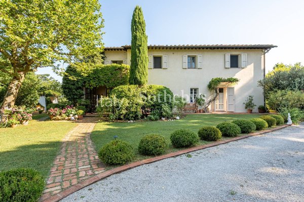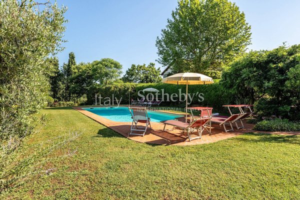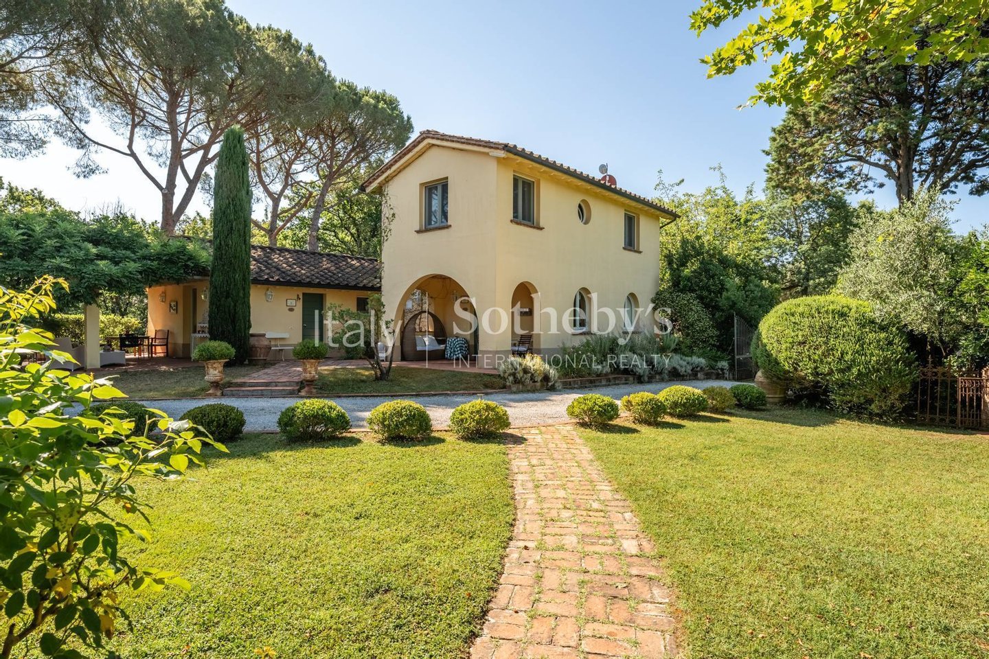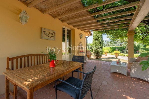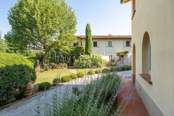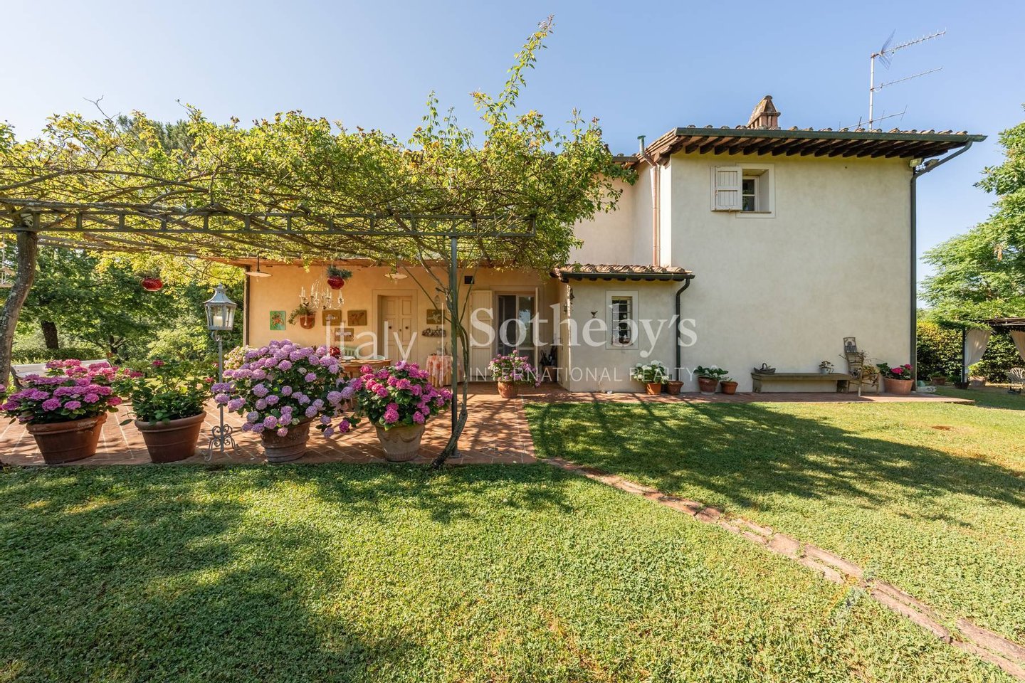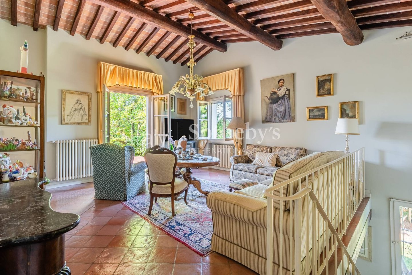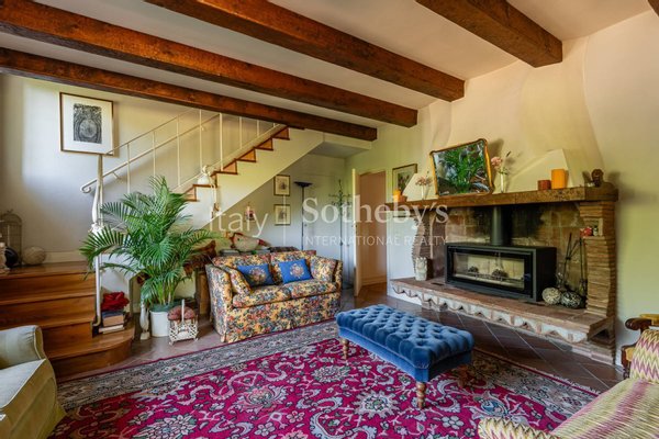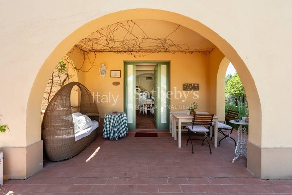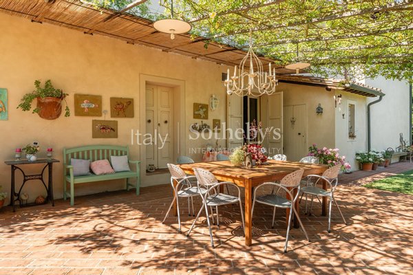 Die Immobilie besteht aus dem Hauptgebäude und einem unabhängigen Nebengebäude und ist von etwa 1 Hektar Land umgeben. Das etwa 330 m² große Landhaus erstreckt sich über zwei Etagen und wurde sorgfältig renoviert, wobei typische architektonische Elemente der toskanischen Tradition erhalten und aufgewertet wurden. Im Erdgeschoss empfängt ein eleganter Eingangsbereich mit Wintergarten in ein großzügiges Wohnzimmer mit Kamin, ein Esszimmer, ein Gäste-WC und eine geräumige Küche mit Zugang zur Pergola im Außenbereich, ausgestattet mit gemauertem Ofen und Grill. Ergänzt wird diese Ebene durch ein Arbeitszimmer und den Technikraum. Die obere Etage beherbergt den Schlafbereich mit vier Doppelzimmern, die einen schönen Blick auf den Garten und die umliegende Landschaft bieten, zwei Bäder sowie ein Wohnzimmer mit Zugang zu einer herrlichen Panoramaterrasse.