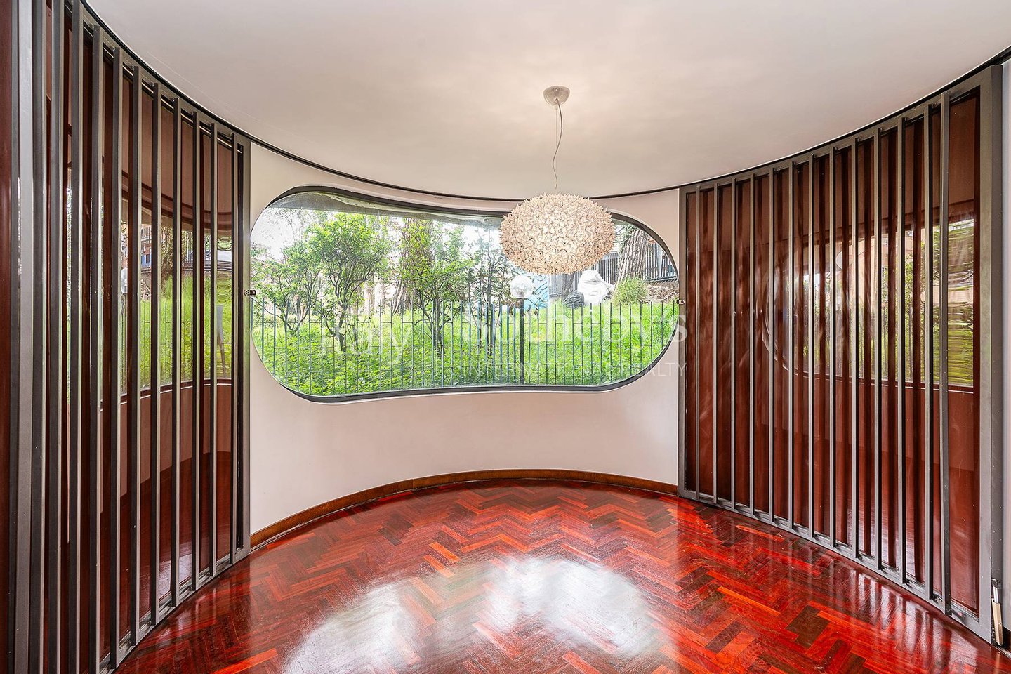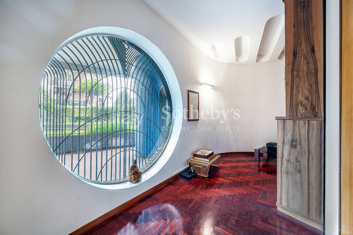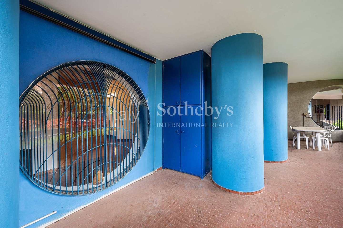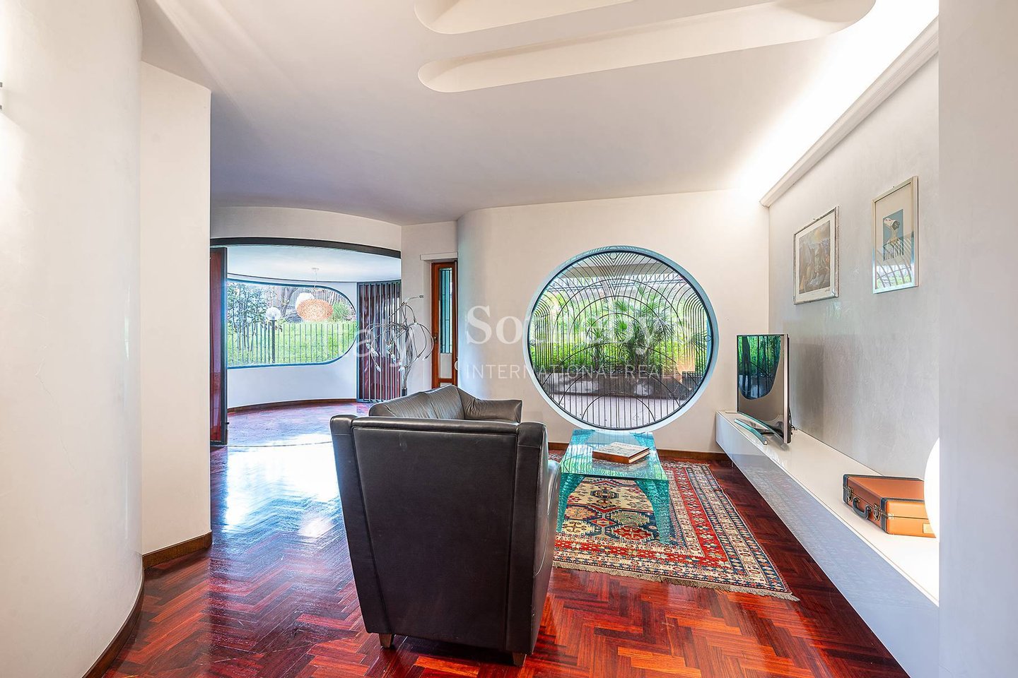 The property stands out for its double living room with dining area, enhanced by distinctive architectural details such as large porthole-style windows that create striking natural light features and lend the living space a modern, sophisticated character.