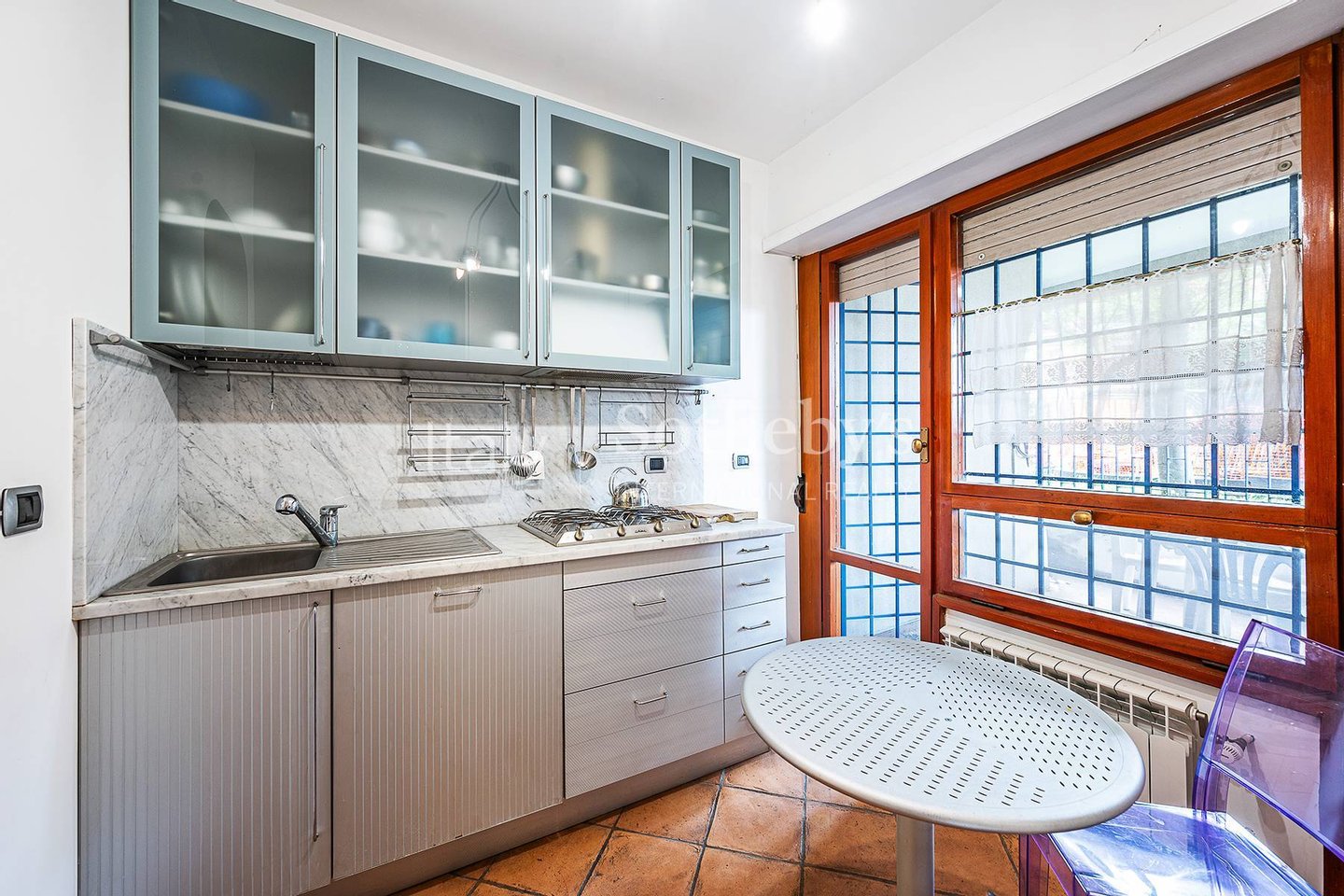 The kitchen opens onto a terrace, ideal for relaxing or entertaining.