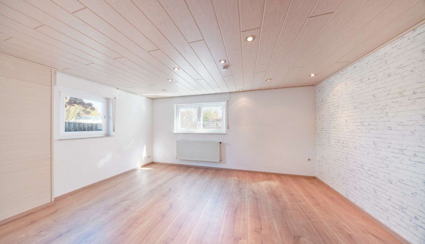 Im ausgebauten Dachgeschoss eröffnet sich weiterhin ein großzügiges Zimmer, welches sich ideal als Büro, Atelier oder Elternbereich eignet. Ein separater Abstellraum bietet Stellfläche für Haushaltsgeräte oder dient als begehbarer Kleiderschrank. Im Kellergeschoss befinden sich drei weitere Zimmer: ein großer Hobbyraum sowie zwei große Kellerräume, die ausreichend Platz zum Lagern bieten. Hier befindet sich zudem ein weiteres Dusch-Bad mit WC.