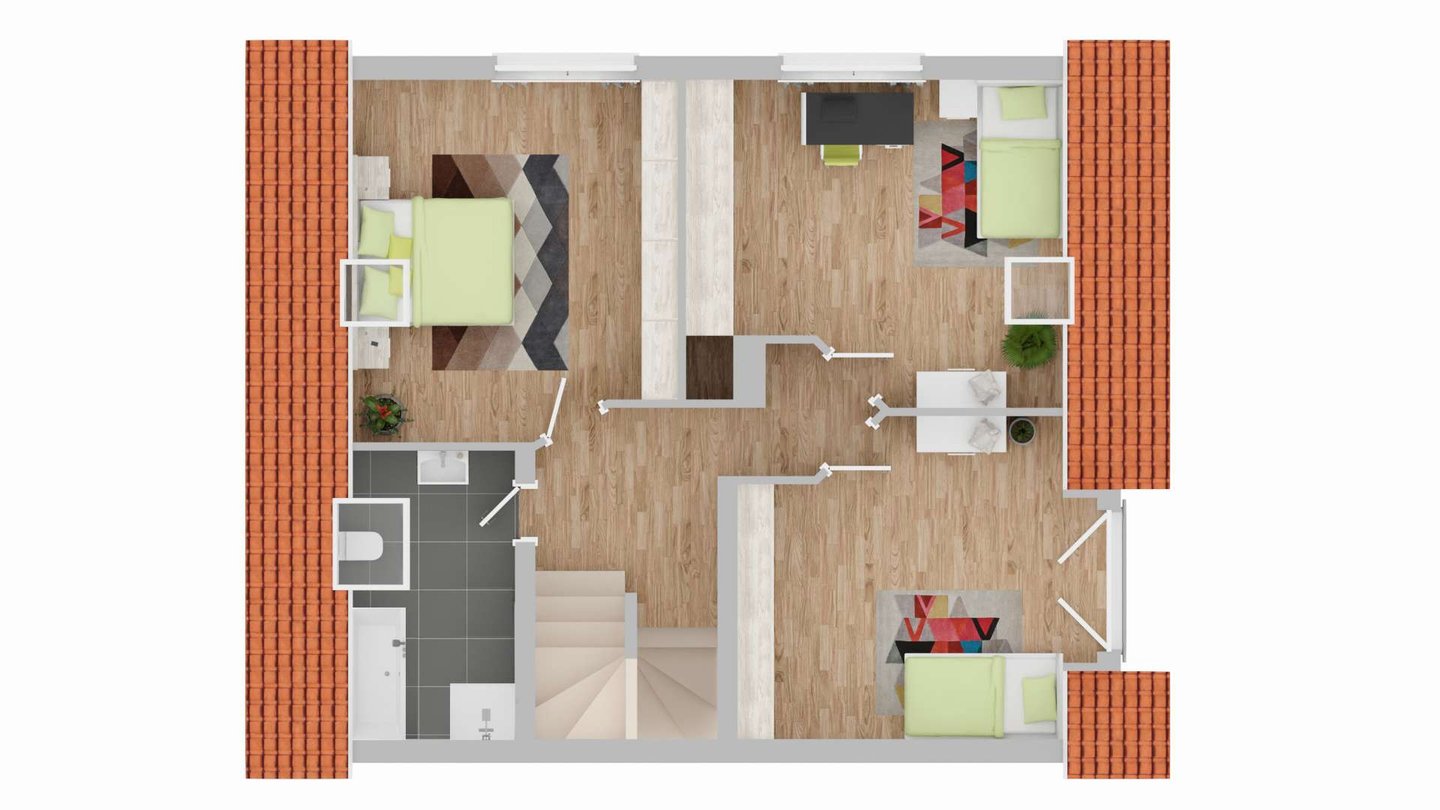 Im Obergeschoss erwarten Sie drei gut geschnittene Zimmer, die Ihnen vielfältige Nutzungsmöglichkeiten bieten – als Schlafzimmer, Kinderzimmer oder persönlicher Rückzugsort. Das helle Badezimmer sorgt für Komfort im Alltag und macht die Etage zu einem tollen Familienbereich.