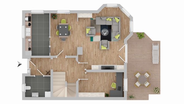 Im Erdgeschoss bildet der großzügige Wohn- und Essbereich das Herzstück des Hauses: lichtdurchflutet, offen gestaltet und mit Zugang zur Terrasse. Hier entstehen die Momente, die den Alltag besonders machen – ob beim Essen, beim Entspannen oder beim Zusammensein mit Familie und Freunden. Die angrenzende Küche ist praktisch geschnitten und fügt sich harmonisch in das Raumkonzept ein. Ergänzt wird diese Ebene durch ein weiteres Zimmer, das flexibel als Homeoffice oder Gästebereich genutzt werden kann, sowie einem Gäste-WC.
