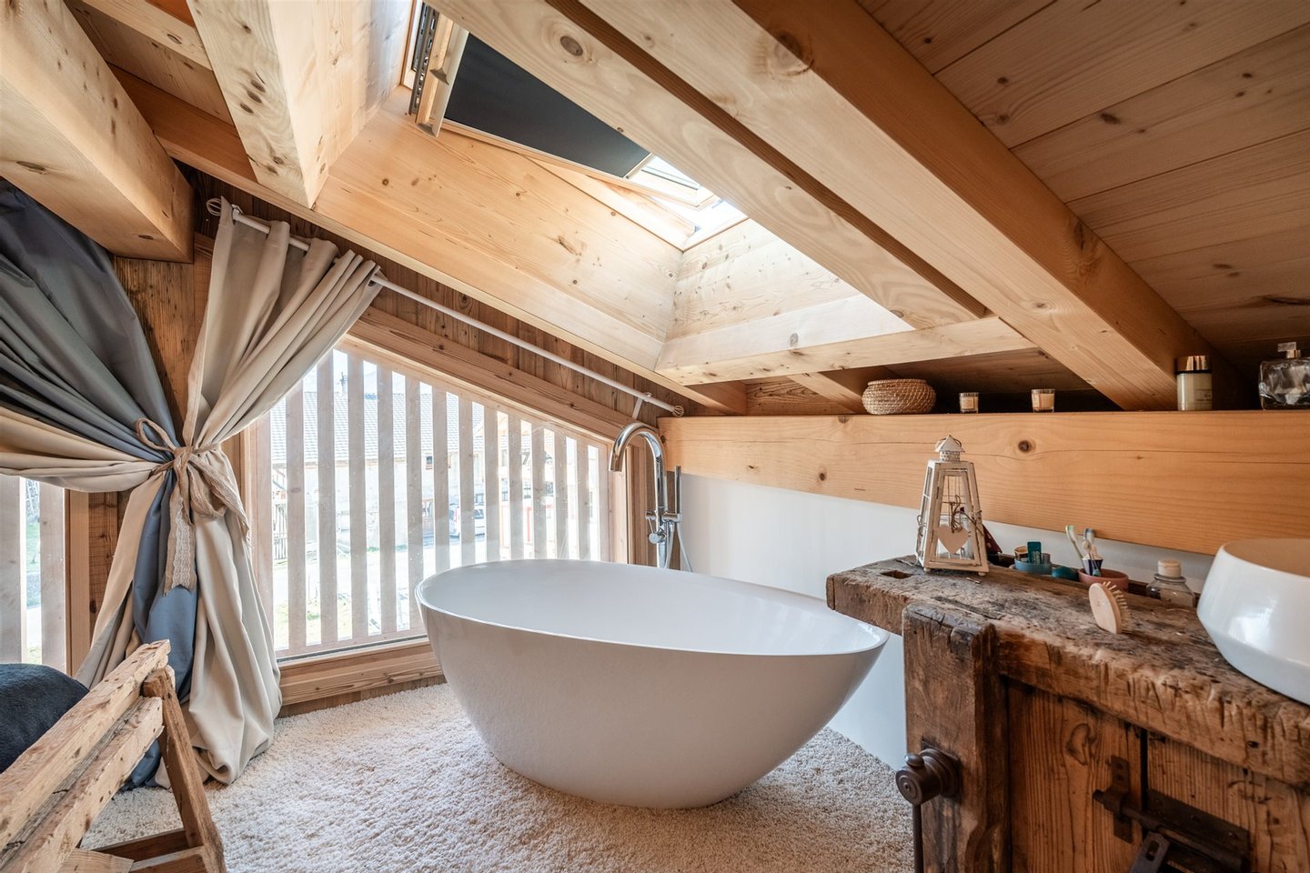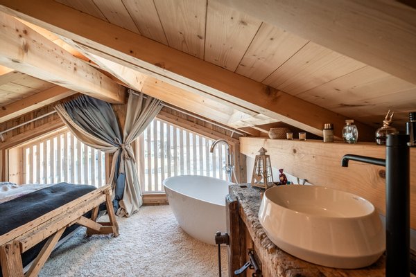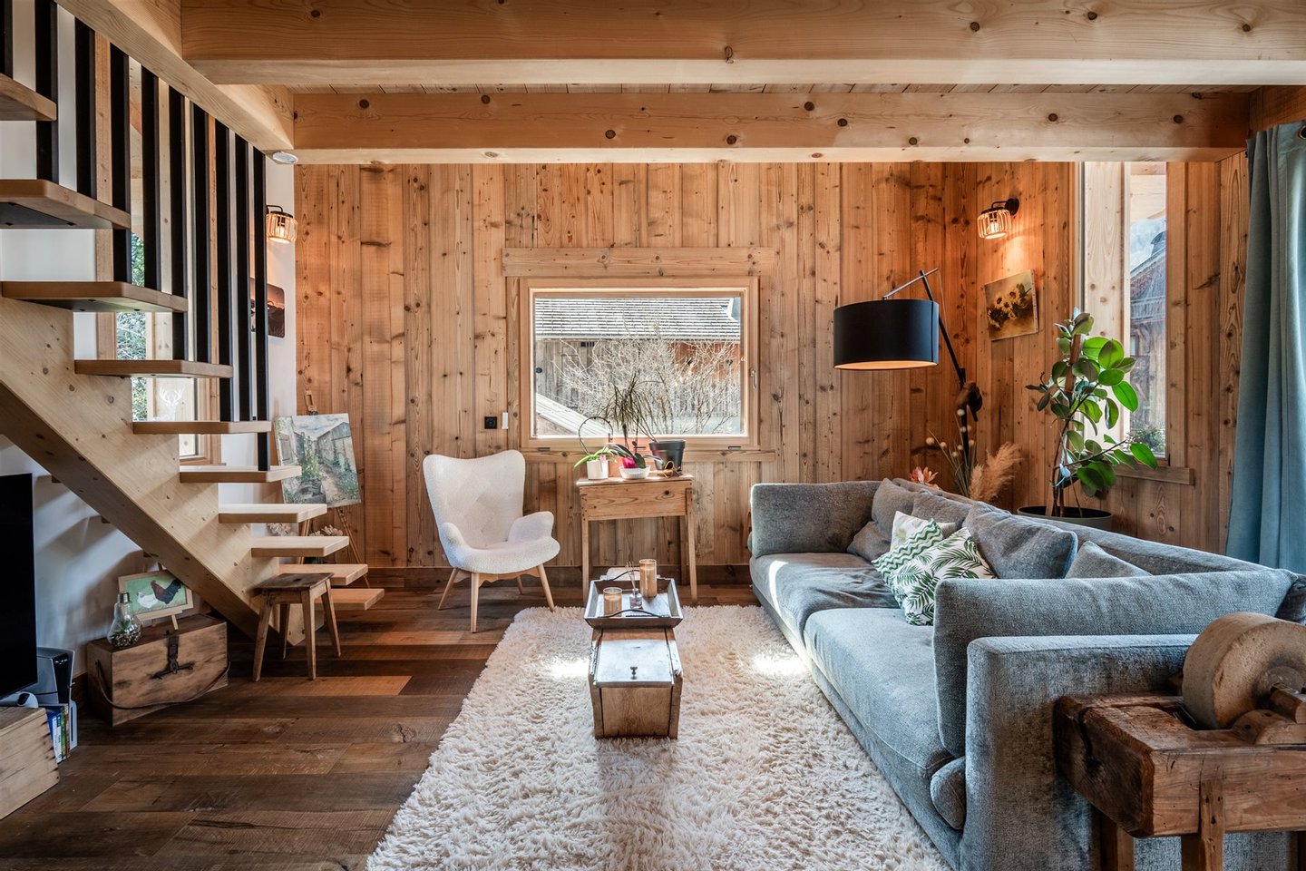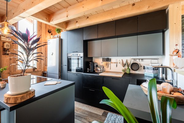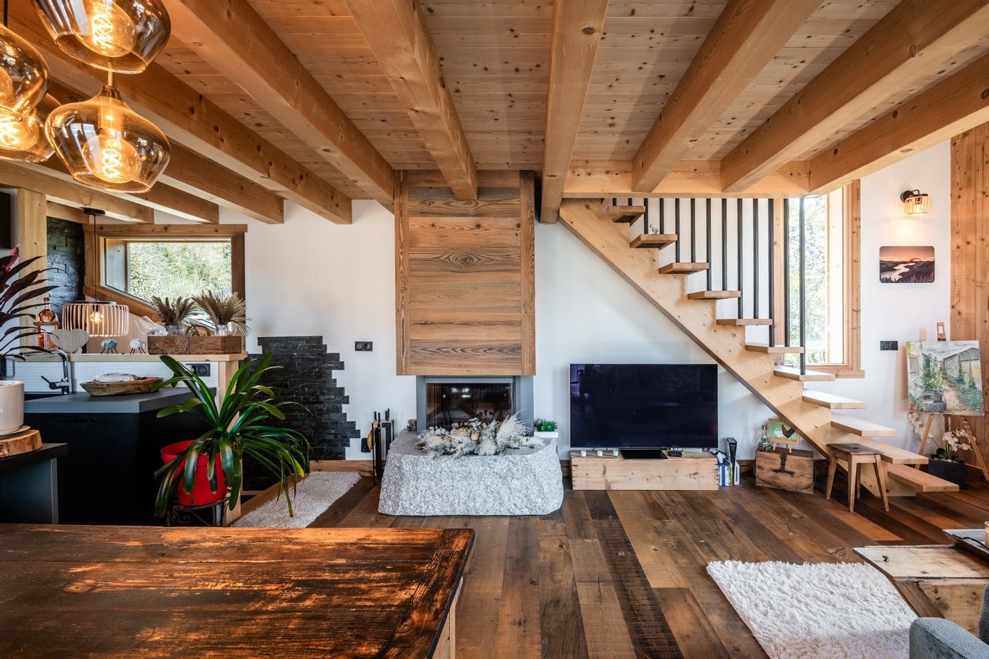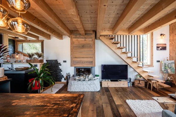 Im Obergeschoss befindet sich ein gemütliches Wohnzimmer mit offener, komplett ausgestatteter Küche und viel Stauraum, entworfen von dem renommierten Küchenchef Bergamote, ein Essbereich und ein Wohnzimmer mit einem schönen Mont-Blanc-Granit- Kamin. Ein Balkon umläuft das Chalet und bietet Zugang zur Terrasse auf Gartenniveau.