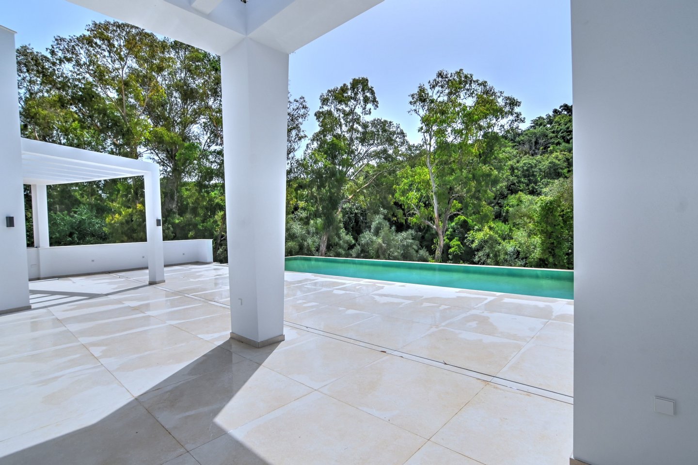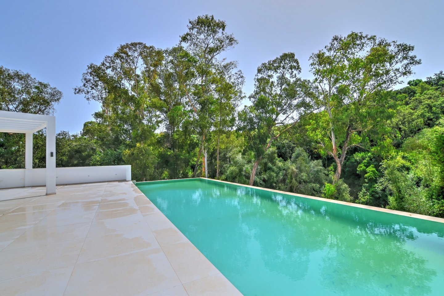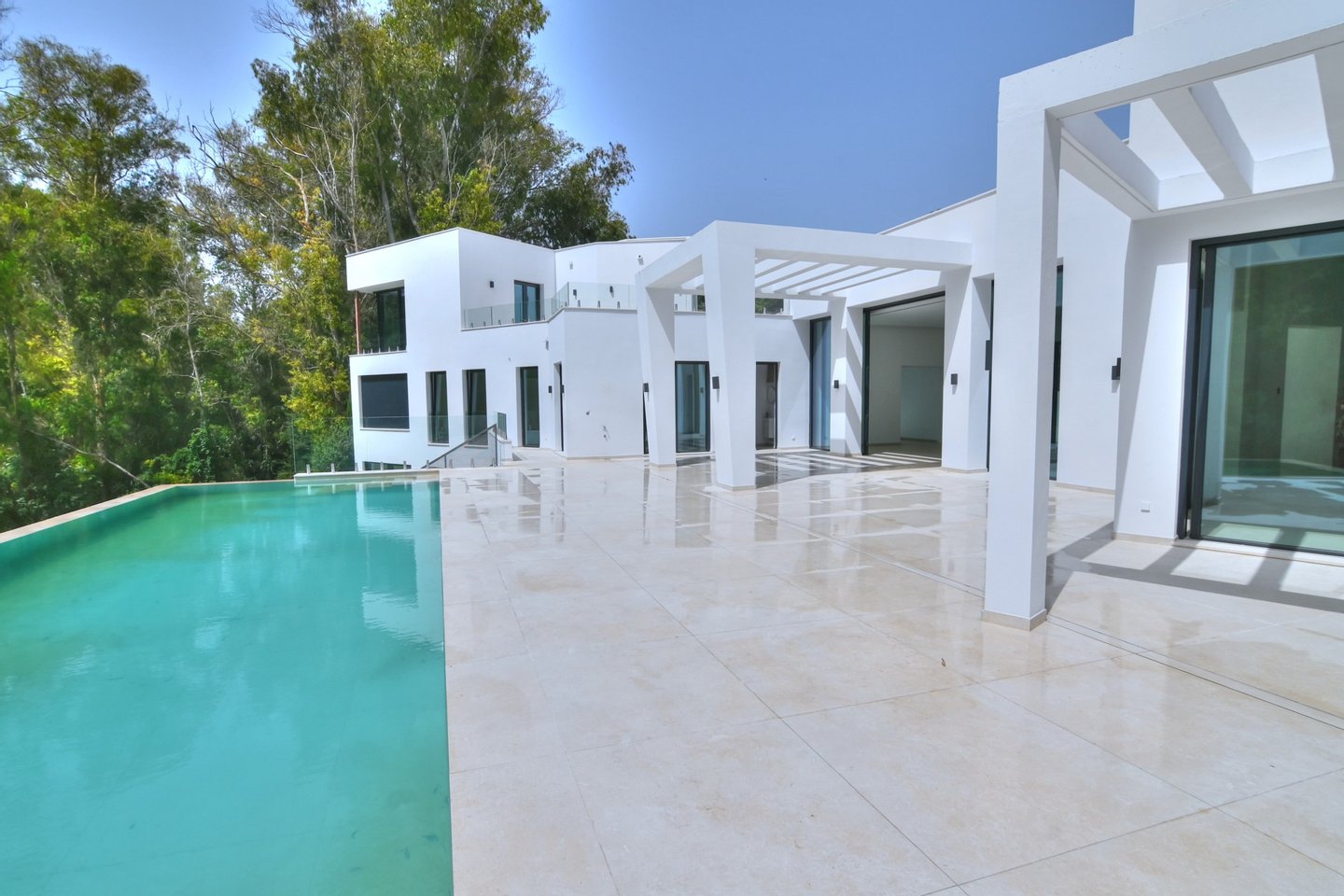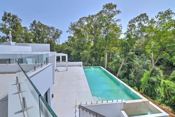 Die Villa verfügt über eine Baufläche von 585 m² sowie 184 m² überdachte und 282 m² offene Terrassen und lädt das ganze Jahr über zu elegantem Wohnen und großzügigem Entertainment im Freien ein. Besonders hervorzuheben ist der spektakuläre, solarbeheizte Salzwasser-Infinity‑Pool (14,5 m), umgeben von Pergolen, Lounge-Zonen und fein gestalteter Architektur-Landschaft.