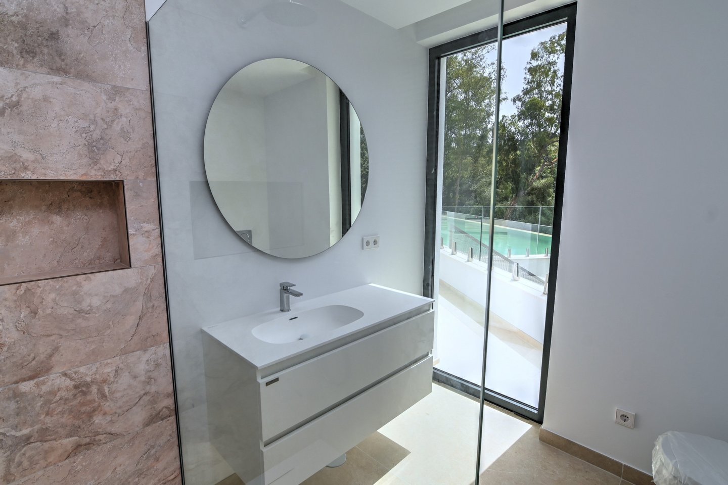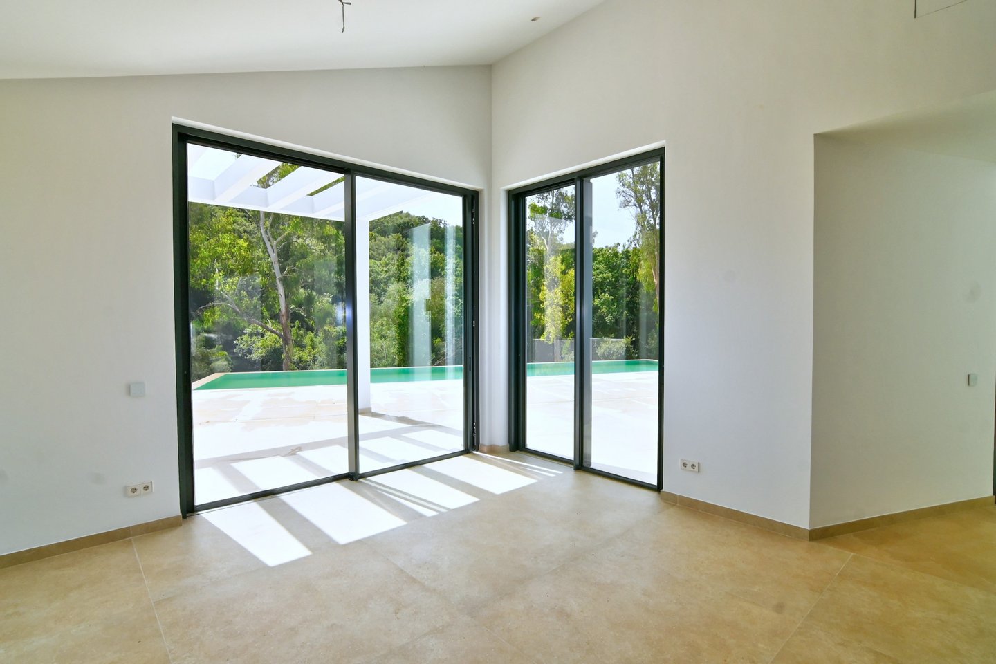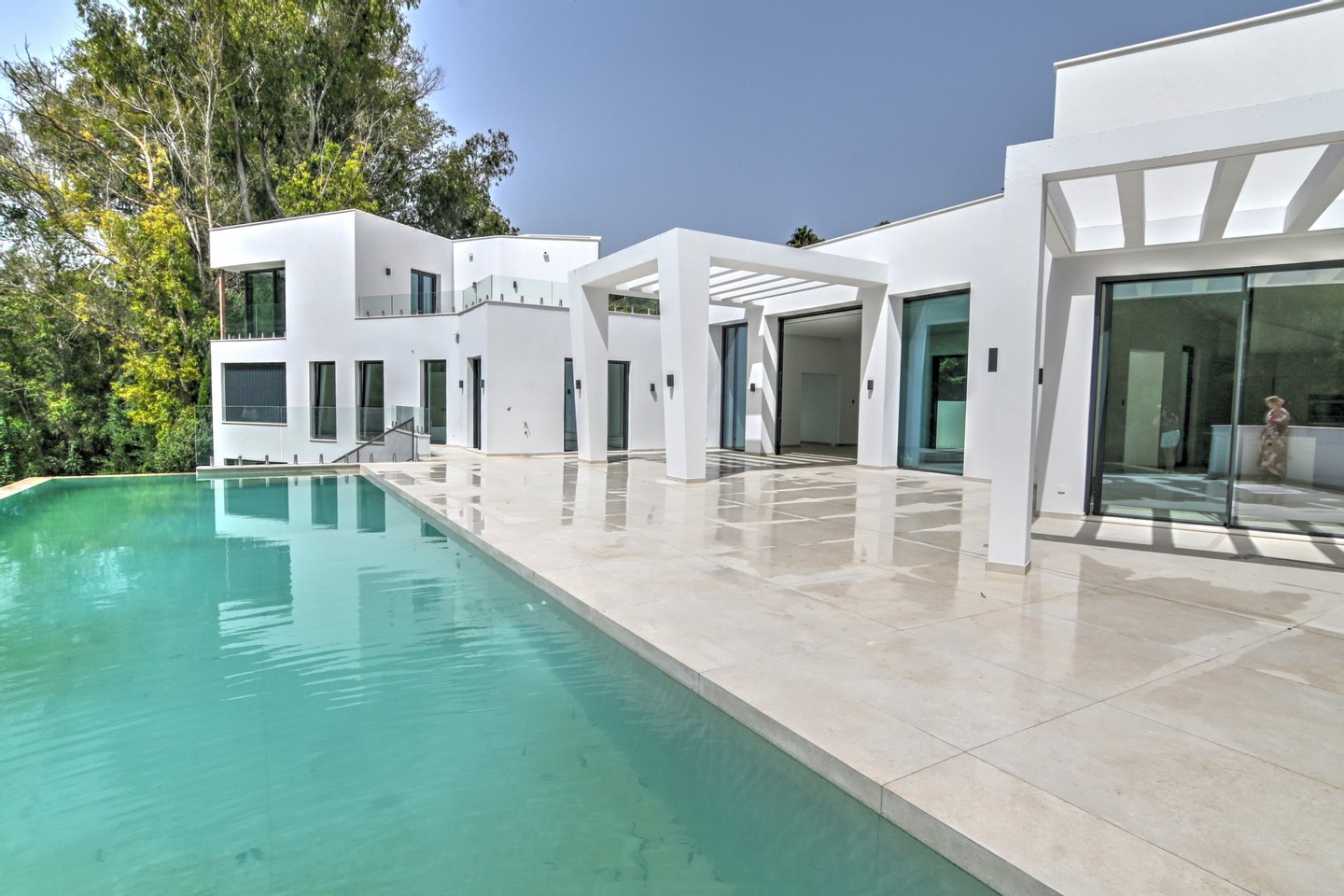 Die Villa verfügt über eine Baufläche von 585 m² sowie 184 m² überdachte und 282 m² offene Terrassen und lädt das ganze Jahr über zu elegantem Wohnen und großzügigem Entertainment im Freien ein. Besonders hervorzuheben ist der spektakuläre, solarbeheizte Salzwasser-Infinity‑Pool (14,5 m), umgeben von Pergolen, Lounge-Zonen und fein gestalteter Architektur-Landschaft.