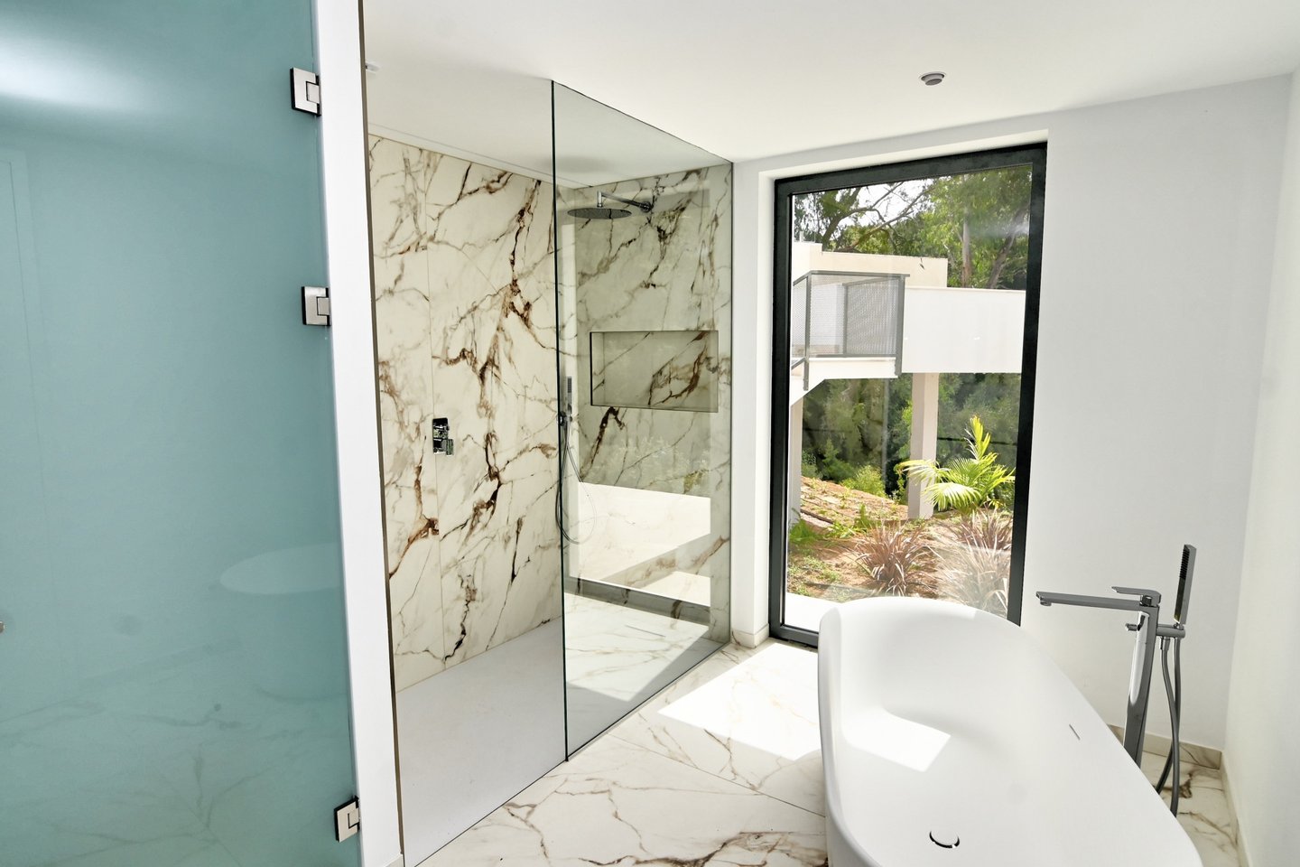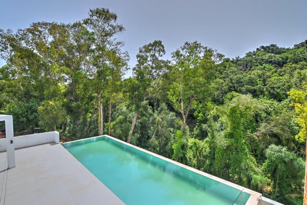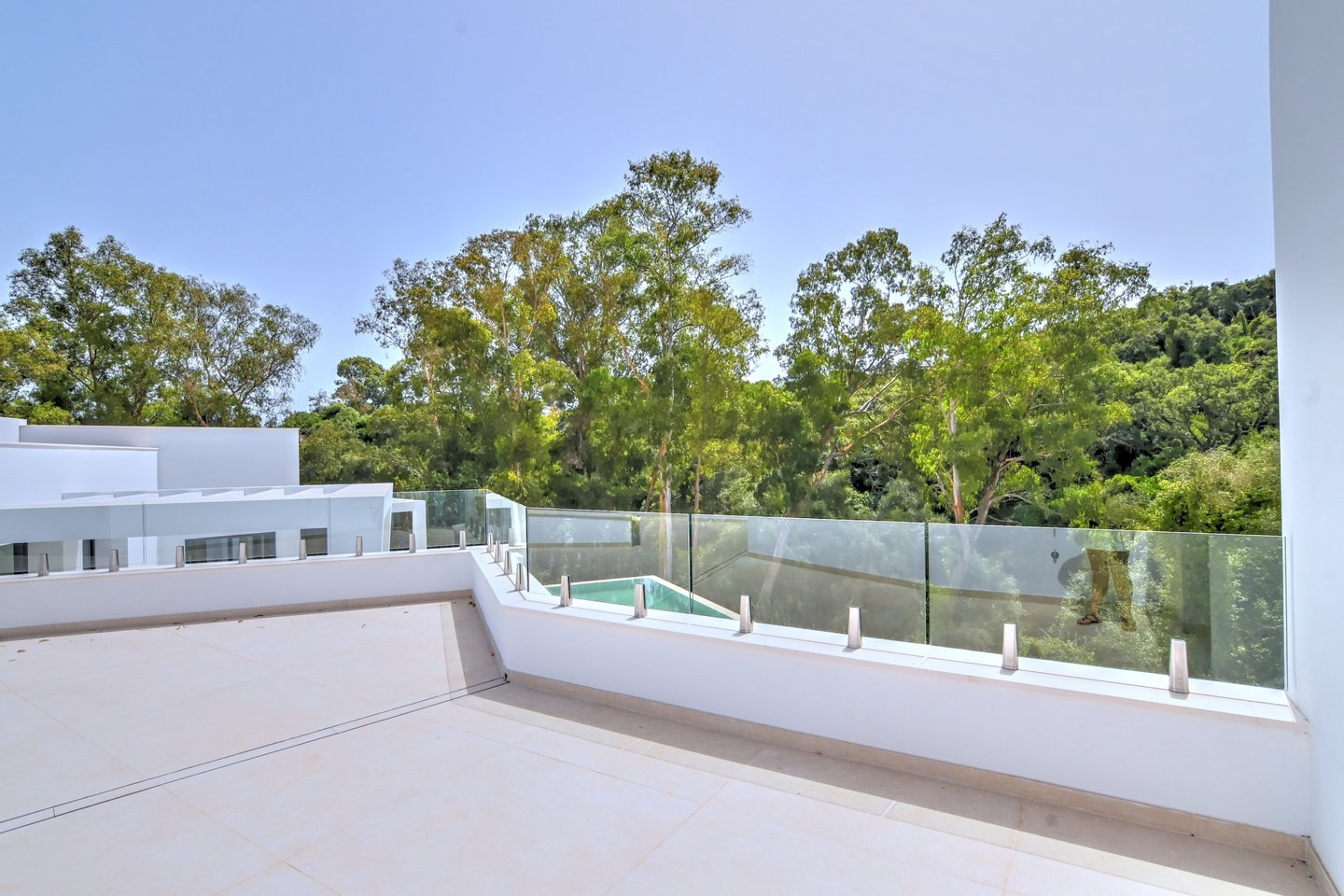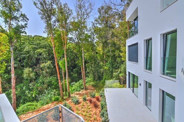 Die Hauptebene umfasst zwei weitere Schlafzimmer en suite mit beeindruckendem Ausblick, ein Wohn‑ und Esszimmer mit großzügigen Glasflächen zur Pool‑Terrasse und dem Wasserbrunnen sowie die luxuriöse Küche mit versteckter Speisekammer. Die obere Etage beherbergt ein fünftes Schlafzimmer en suite und bietet Zugang zur ruhigen Dachterrasse – perfekt zum Sonnenbaden, Yoga oder zum Sonnenuntergangs‑Genuss.