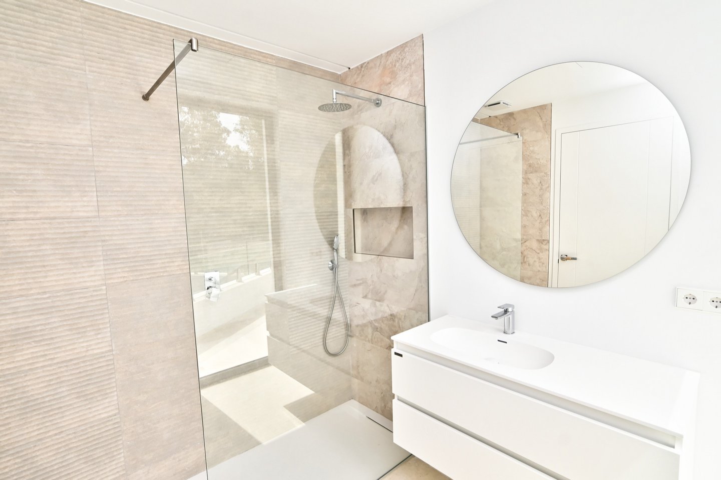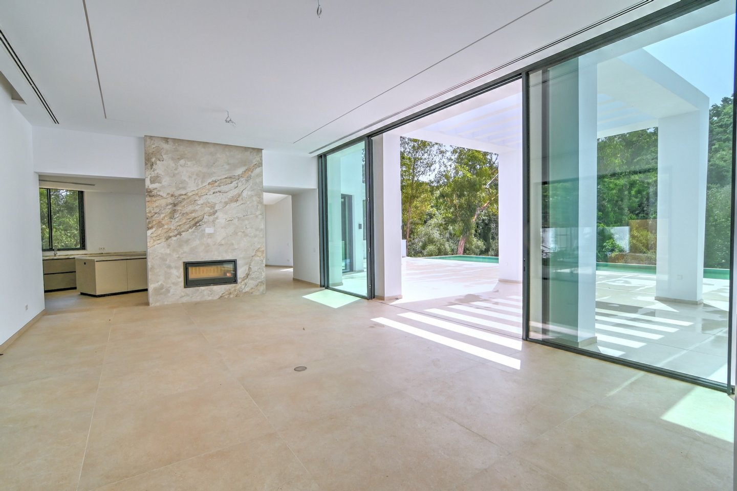 Über drei Ebenen verteilt bietet der Innenraum fünf geräumige Schlafzimmer en suite und vier Bäder mit Spa-Charakter. Das lichtdurchflutete, offene Raumkonzept nimmt die Außenanlagen, Pool und den beruhigenden Wassergarten durch bodentiefe Schiebetüren nahtlos auf. Ein moderner Kamin dient als architektonisches Herzstück, unterstützt von stimmungsvoller Smart‑Beleuchtung und einem dekorativen Brunnen, der Ruhe verströmt.