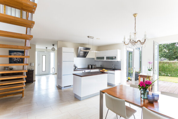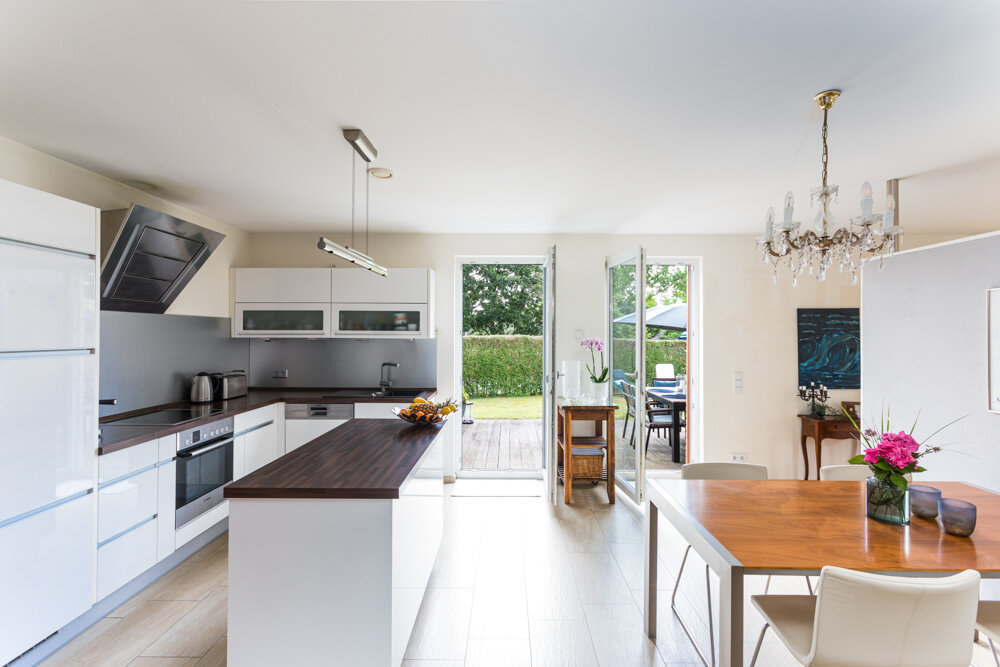 Die moderne Einbauküche fügt sich harmonisch in den offenen Wohnbereich ein. Vom Erdgeschoss aus gelangen Sie auf zwei Terrassen, während im Obergeschoss zwei Balkone zur Verfügung stehen – insgesamt vier Außenbereiche, die den Wohnraum ins Freie erweitern und vielfältige Nutzungsmöglichkeiten bieten.