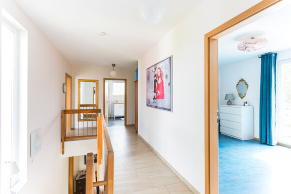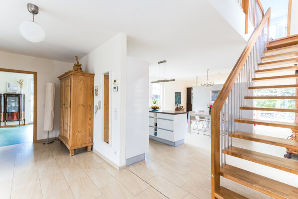 Im Innenbereich sorgen Parkett- und Linoleumböden sowie eine massive Treppe und Türen aus Eichenholz für ein elegantes und zugleich wohnliches Ambiente. Die Kombination aus Fußbodenheizung und effizienter Erdwärmepumpe gewährleistet ein angenehmes Raumklima bei gleichzeitig nachhaltiger Energienutzung. Ergänzt wird dies durch eine kontrollierte Be- und Entlüftungsanlage mit Wärmerückgewinnung.