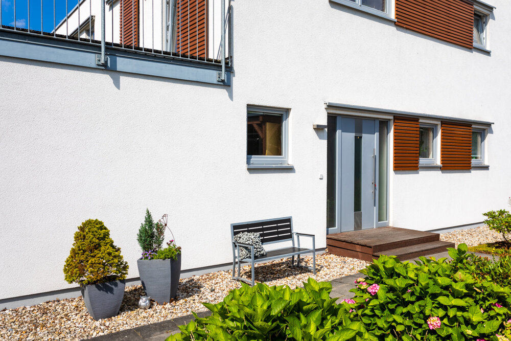 Insgesamt stehen fünf Zimmer zur Verfügung, darunter drei komfortable Schlafzimmer. Zwei Badezimmer – ein Vollbad sowie ein Gäste-Duschbad – sorgen für Wohnkomfort und Alltagstauglichkeit. Großzügige, bodentiefe Fensterflächen lassen viel Tageslicht in die Räume und schaffen eine helle, freundliche Wohnatmosphäre. Die Holz-Schiebeläden bieten dabei einen funktionalen Sicht- und Sonnenschutz und unterstreichen das moderne Erscheinungsbild.