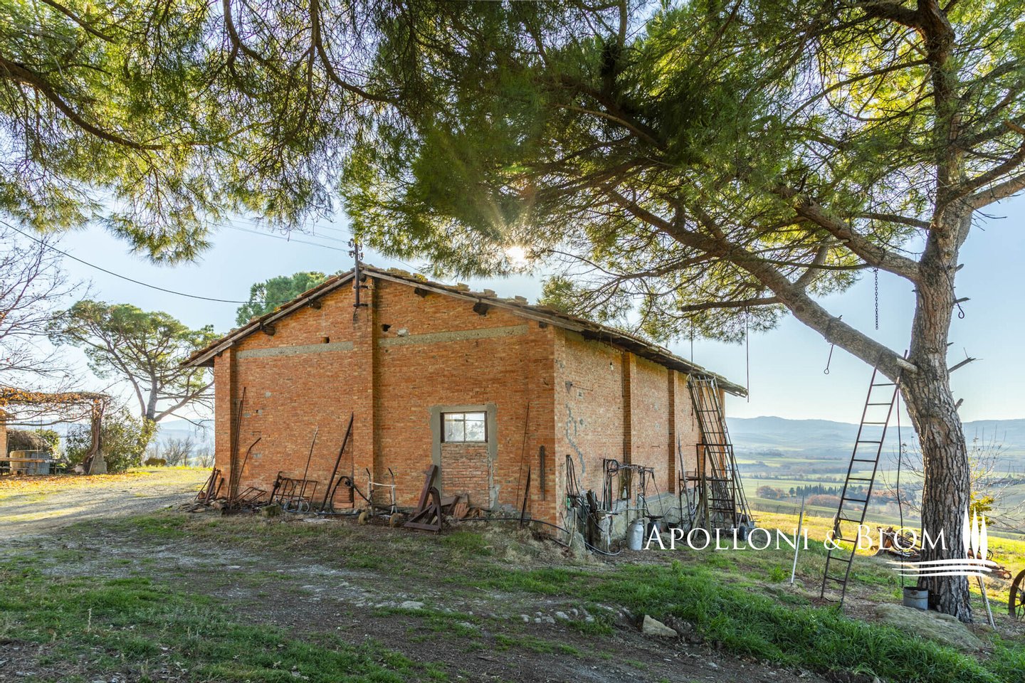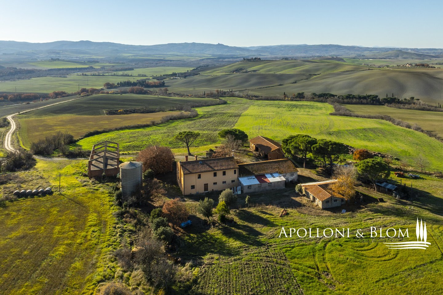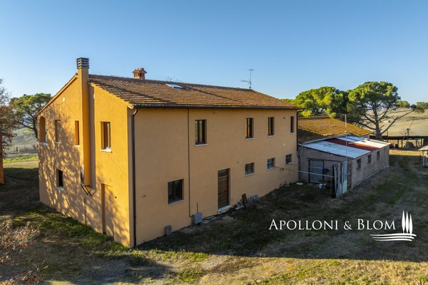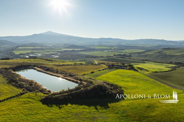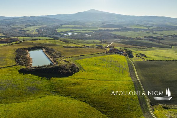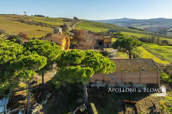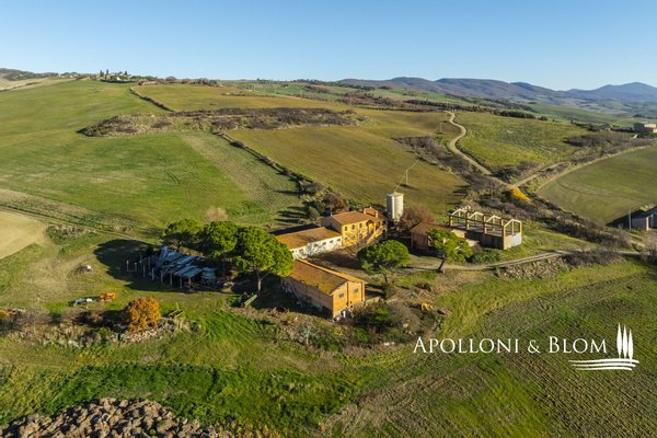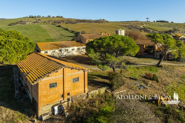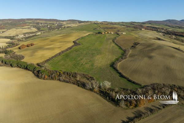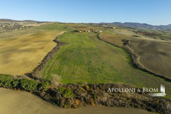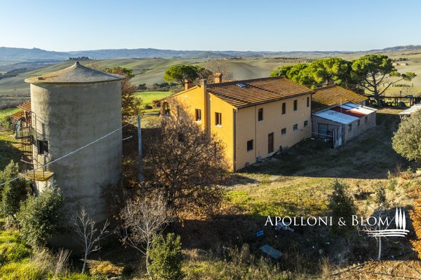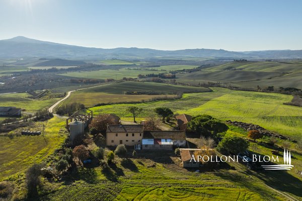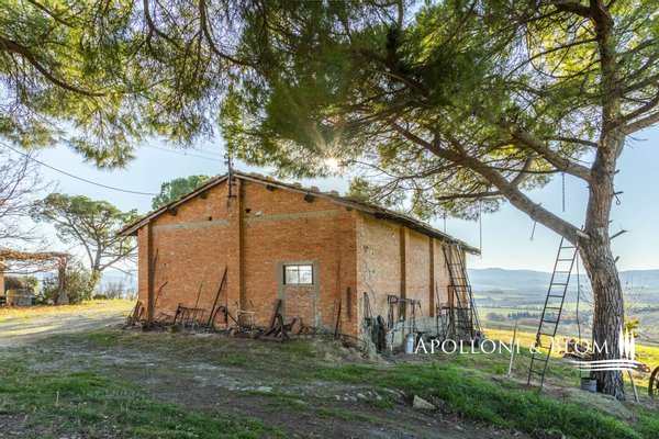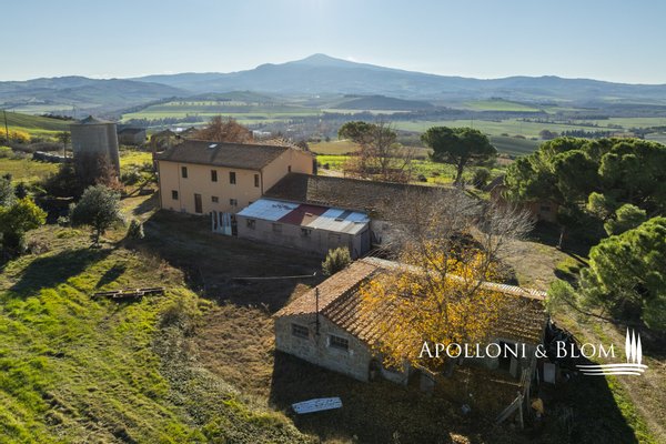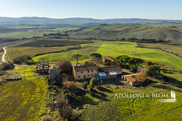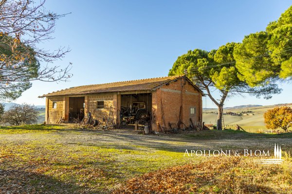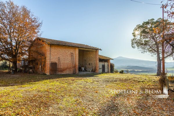 In bezaubernder Lage, umgeben von 104 Hektar Land, klassisches Bauernhaus mit zu restaurierenden Nebengebäuden, in der Nähe von Pienza zu verkaufen. Auf einem Hügel mit herrlichem Blick über das berühmte Val d'Orcia zum Monte Amiata gelegen, präsentieren wir ein landwirtschaftliches Anwesen von mehr als 104 Hektar Ackerland mit Bauernhaus und Nebengebäuden, die restauriert werden müssen. Das Hauptgebäude zeichnet sich durch eine regelmäßige rechteckige Struktur mit verputzten Fassaden, ein 2018 isoliertes Dach und eine Fläche von 700 Quadratmetern auf zwei Ebenen aus. Das Obergeschoss ist über eine klassische gemauerte Außentreppe mit einer beeindruckenden Loggia zugänglich. Obwohl einige Teile des Hauses renovierungsbedürftig sind, finden sich dort noch Elemente aus der Zeit, wie Terrakottaböden, hohe Decken mit freiliegenden Holzbalken und zwei Steinkamine. Der untere Teil des Bauernhauses umfasst eine Wohnküche mit Kamin, ein Schlafzimmer und ein Badezimmer und grenzt direkt an einen Schuppen, der ursprünglich als Traktorschuppen genutzt wurde und erhebliche Möglichkeiten für eine Umnutzung und Volumenrückgewinnung bietet. Um das Bauernhaus herum befinden sich weitere Nebengebäude mit einer Gesamtfläche von 461 Quadratmetern: drei vom Hauptgebäude getrennte gemauerte Nebengebäude/Dachhäuser, ein Silo und weitere Blechschuppen. Zu den Einrichtungen gehören eine Garage und Außenparkplätze. Ein ideales Objekt für landwirtschaftliche Unternehmer oder Investoren, die ein großes produktives Anwesen mit einem renovierungsbedürftigen Bauernhaus und Nebengebäuden, einem unvergleichlichen Panoramablick über das Val d'Orcia und Entwicklungsmöglichkeiten ohne strenge Baubeschränkungen suchen.