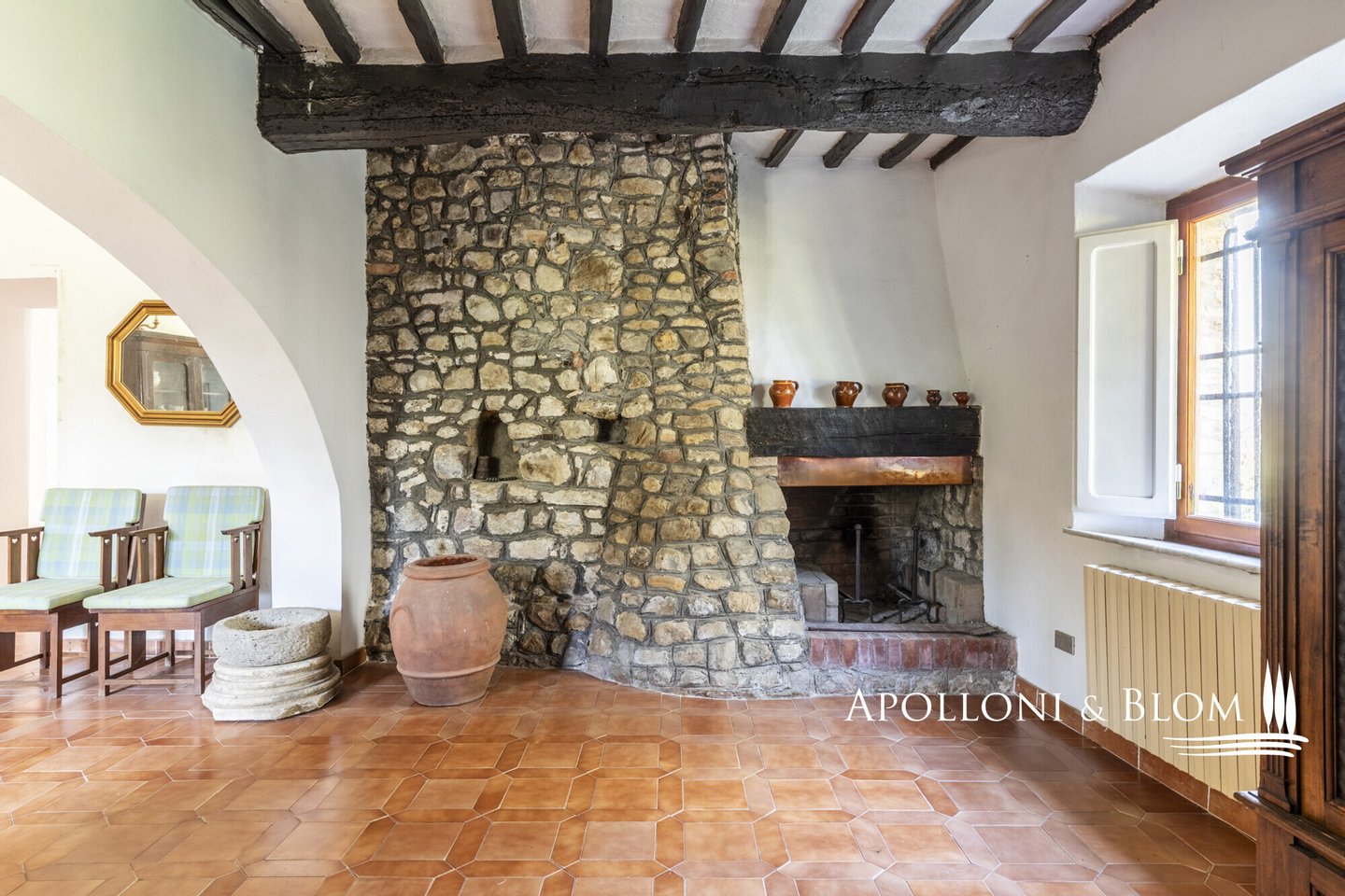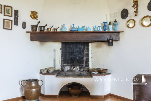 Erdgeschoss - 233 m²: 29 m² großer Raum mit großem Zugangsbogen für Abstellzwecke; Haupteingang mit Flur und internem Zugang zum Untergeschoss; Eingangshalle, Wohnzimmer mit großem zentralen Bogen, Steinwänden und Kamin, bewohnbare Küche (neu), 3