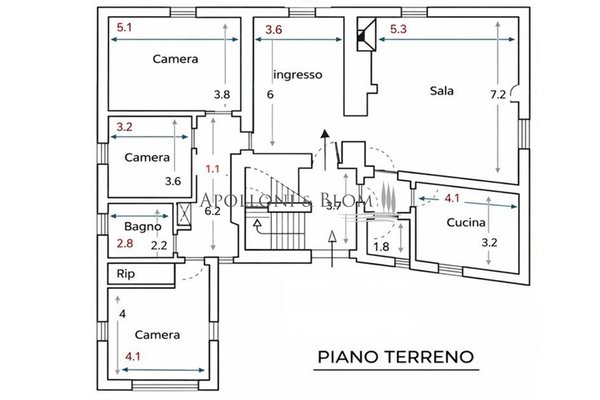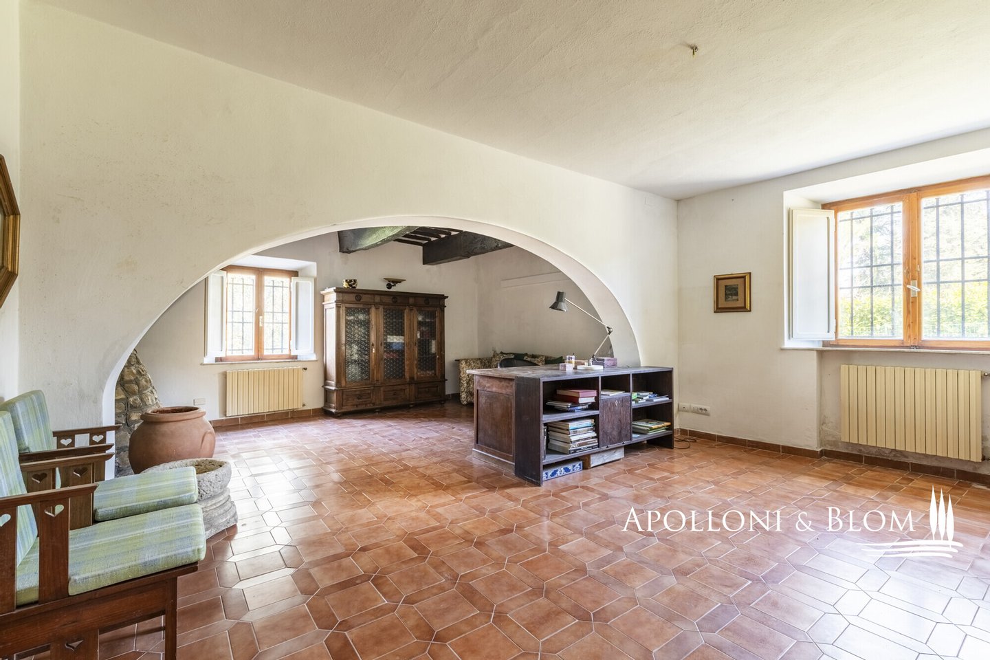 Erdgeschoss - 233 m²: 29 m² großer Raum mit großem Zugangsbogen für Abstellzwecke; Haupteingang mit Flur und internem Zugang zum Untergeschoss; Eingangshalle, Wohnzimmer mit großem zentralen Bogen, Steinwänden und Kamin, bewohnbare Küche (neu), 3