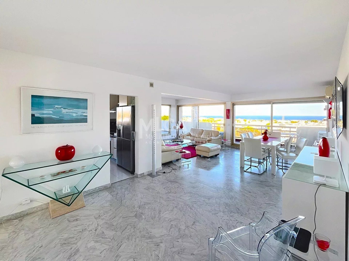 In einer stilvollen Wohnanlage mit Hausmeister, Pool und Tennis, wenige Gehminuten vom Bahnhof und der Innenstadt entfernt, entdecken Sie diese 118 m² große Wohnung mit 4 Schlafzimmern, einer 166 m² großen Terrasse und Panoramablick auf das Meer, die