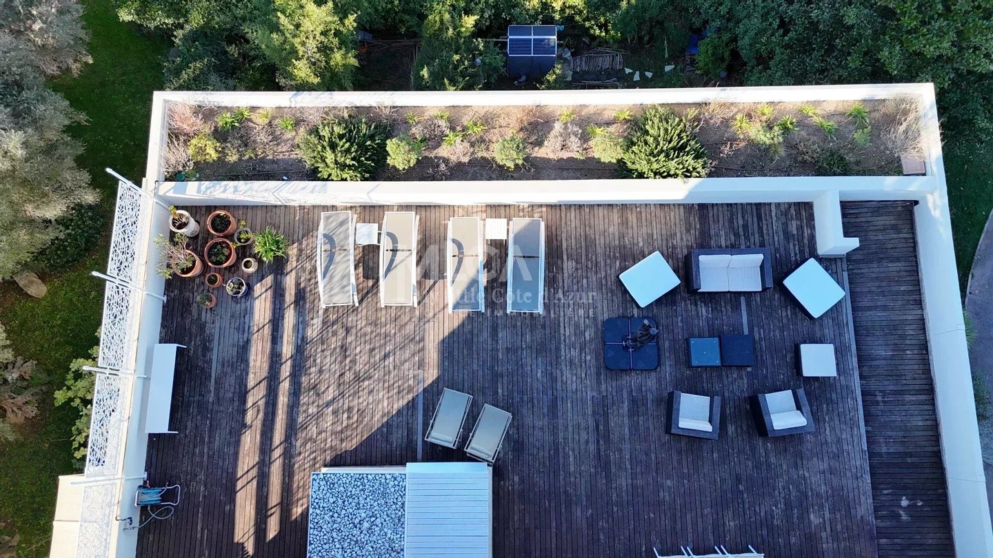 In einer stilvollen Wohnanlage mit Hausmeister, Pool und Tennis, wenige Gehminuten vom Bahnhof und der Innenstadt entfernt, entdecken Sie diese 118 m² große Wohnung mit 4 Schlafzimmern, einer 166 m² großen Terrasse und Panoramablick auf das Meer, die Berge und die Bucht von Nizza. Die Wohnung besteht aus einem Flur, einem hellen Wohn- bzw. Esszimmer, einer separaten Küche, vier Schlafzimmern, zwei Badezimmern, zwei WC sowie einer großen 180 m² Terrasse, einer Garage, einem Parkplatz und einem Keller. Die Residenz ist bekannt für ihre Lebensqualität, mit einer Parkanlage, Pool, zwei Tennisplätzen und liegt in der Nähe des Zentrums von Antibes. Ein Atem beraubender Ausblick und eine privilegierte Lebensumgebung.