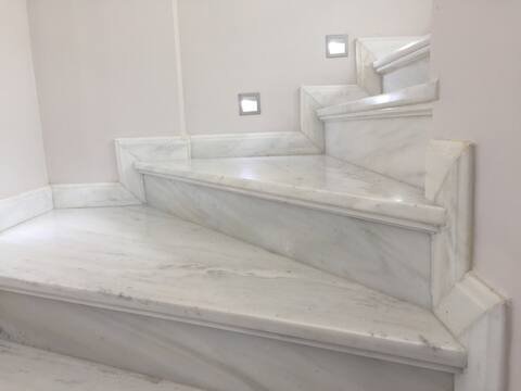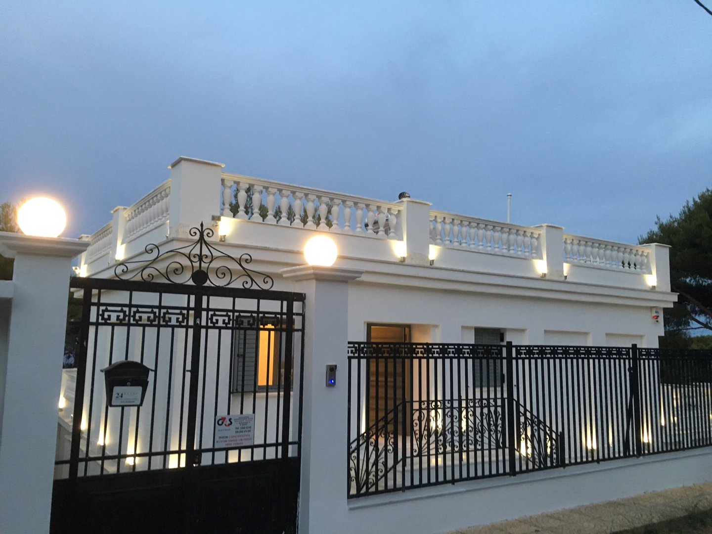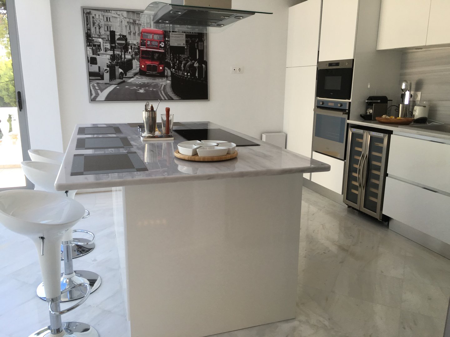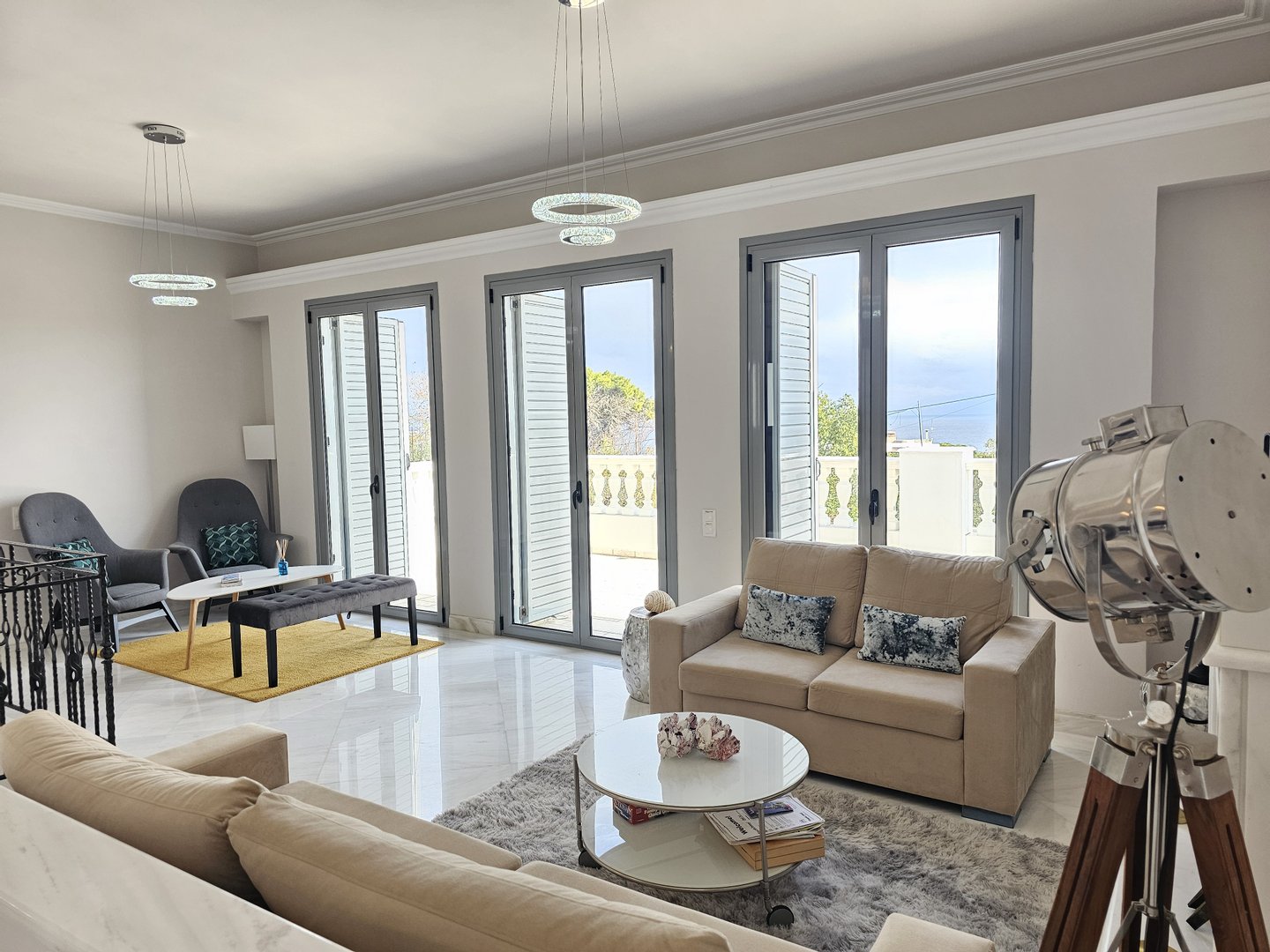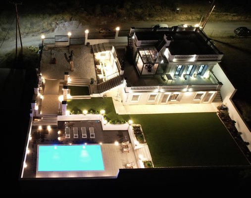 Die Architektur zeichnet sich durch klare weiße Linien, natürliche Marmorakzente und weitläufige Glasöffnungen aus, die das Licht durchgehend anziehen. Der Haupteingang entfaltet sich als offener Wohn- und Speiseraum, der sich direkt auf eine panoramisch umlaufende Terrasse erstreckt, die sowohl für Unterhaltung als auch für ruhige Rückzugsorte gedacht ist.