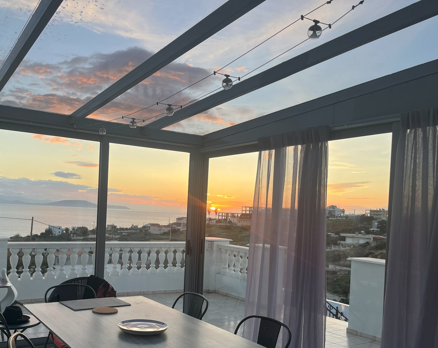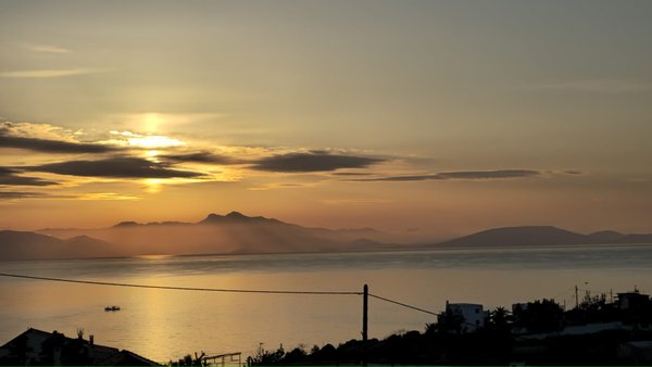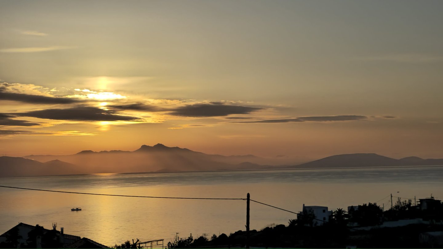 Erhöhtes Küstenleben mit ununterbrochenem Sonnenaufgangsblick über die Ägäis bei Athen.