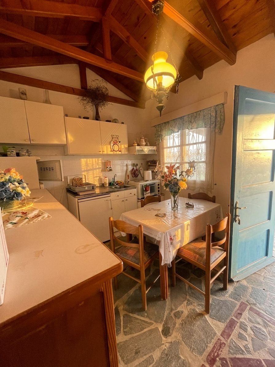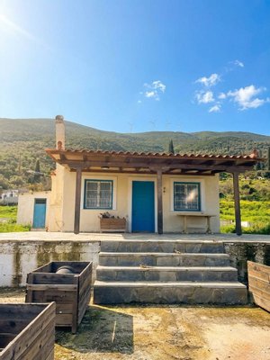 Zu verkaufen im Poros-Gebiet - Peloponnes. Hübsche Hütte von 60 m2, umgeben von unberührter mediterraner Natur in einem Grundstück von 3.700 m2. Großartige Aussichten. 2 Schlafzimmer, Bad, Wohnzimmer mit Kamin und offene Küche. Geräumige Veranda mit