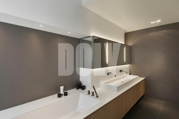 Ein Flur führt zum Schlafbereich, der aus drei Schlafzimmern besteht, darunter eine Master-Suite mit Umkleide- und Duschraum sowie ein zweites Badezimmer und eine Gästetoilette.