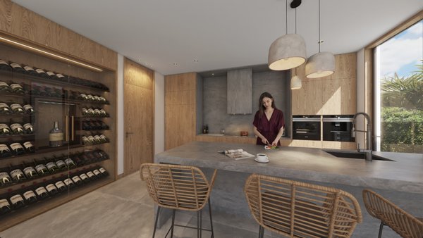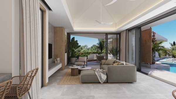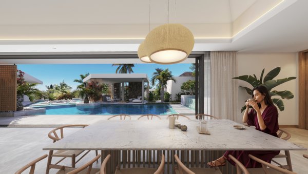 Beim Betreten öffnet sich die Villa zu hellen und großzügigen Wohnbereichen, bestehend aus einem Wohnzimmer und einem Essbereich, die durch weitläufige überdachte Terrassen erweitert werden. Die Raumaufteilung ist um einen Infinity-Pool herum konzipiert, der zum zentralen Element des Hauses wird und eine nahtlose Verbindung zwischen Innen- und Außenbereichen schafft.