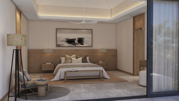 Der Schlafbereich umfasst vier Schlafzimmer, darunter drei mit eigenem Bad, die in einem Pavillon-Stil angeordnet sind und sowohl Unabhängigkeit als auch Privatsphäre ermöglichen. Großzügige Öffnungen und harmonische Proportionen schaffen eine ruhige und elegante Atmosphäre mit direktem Zugang zum angelegten Garten und den Außenbereichen.