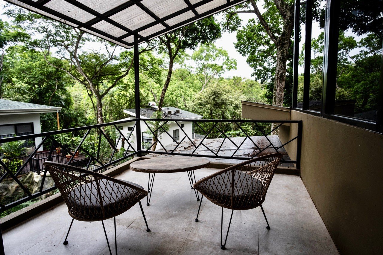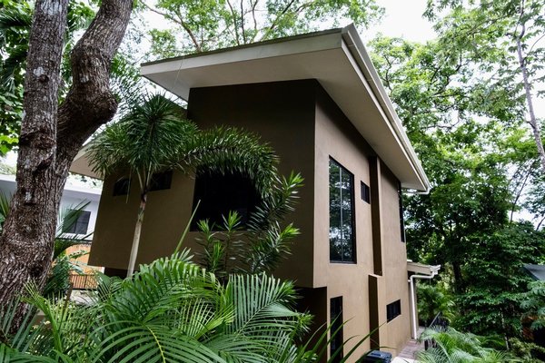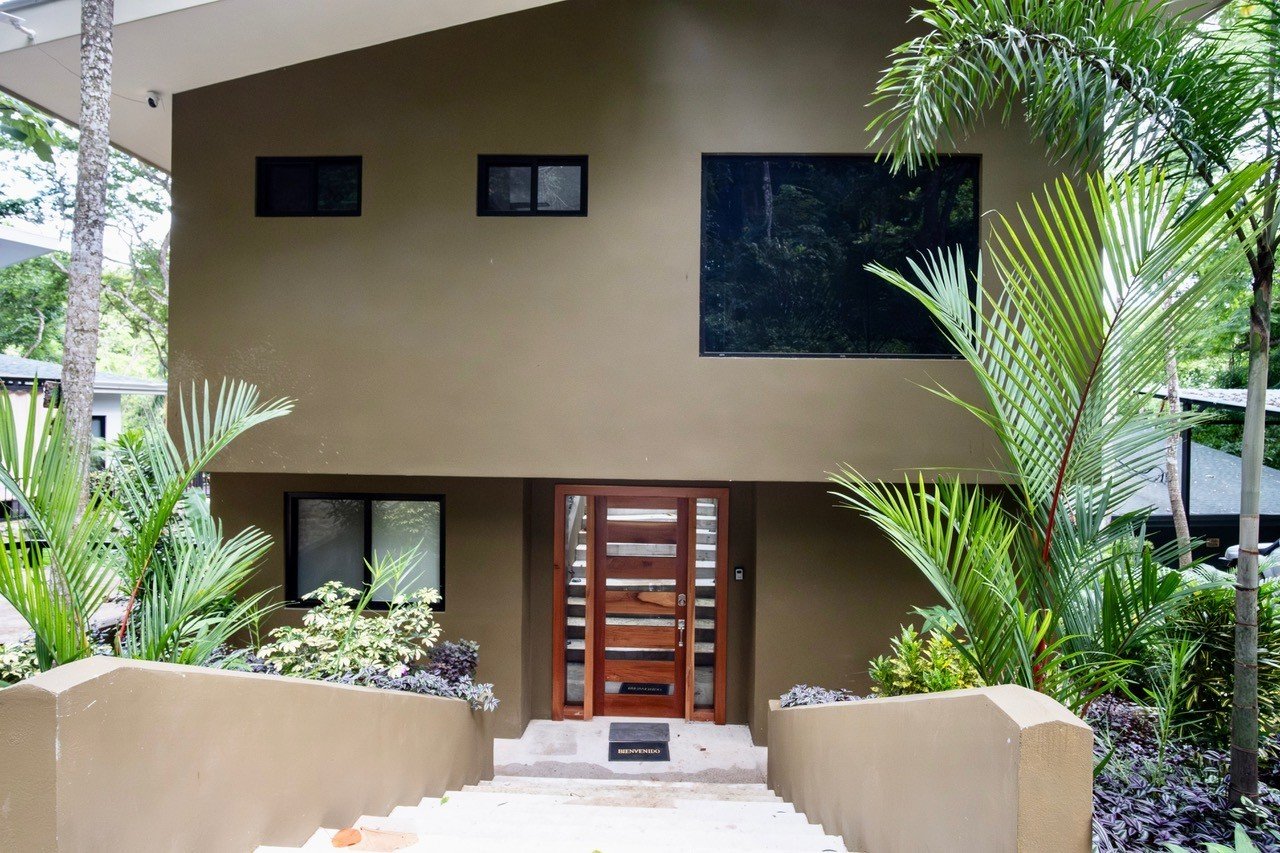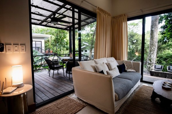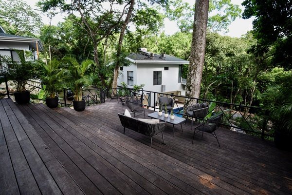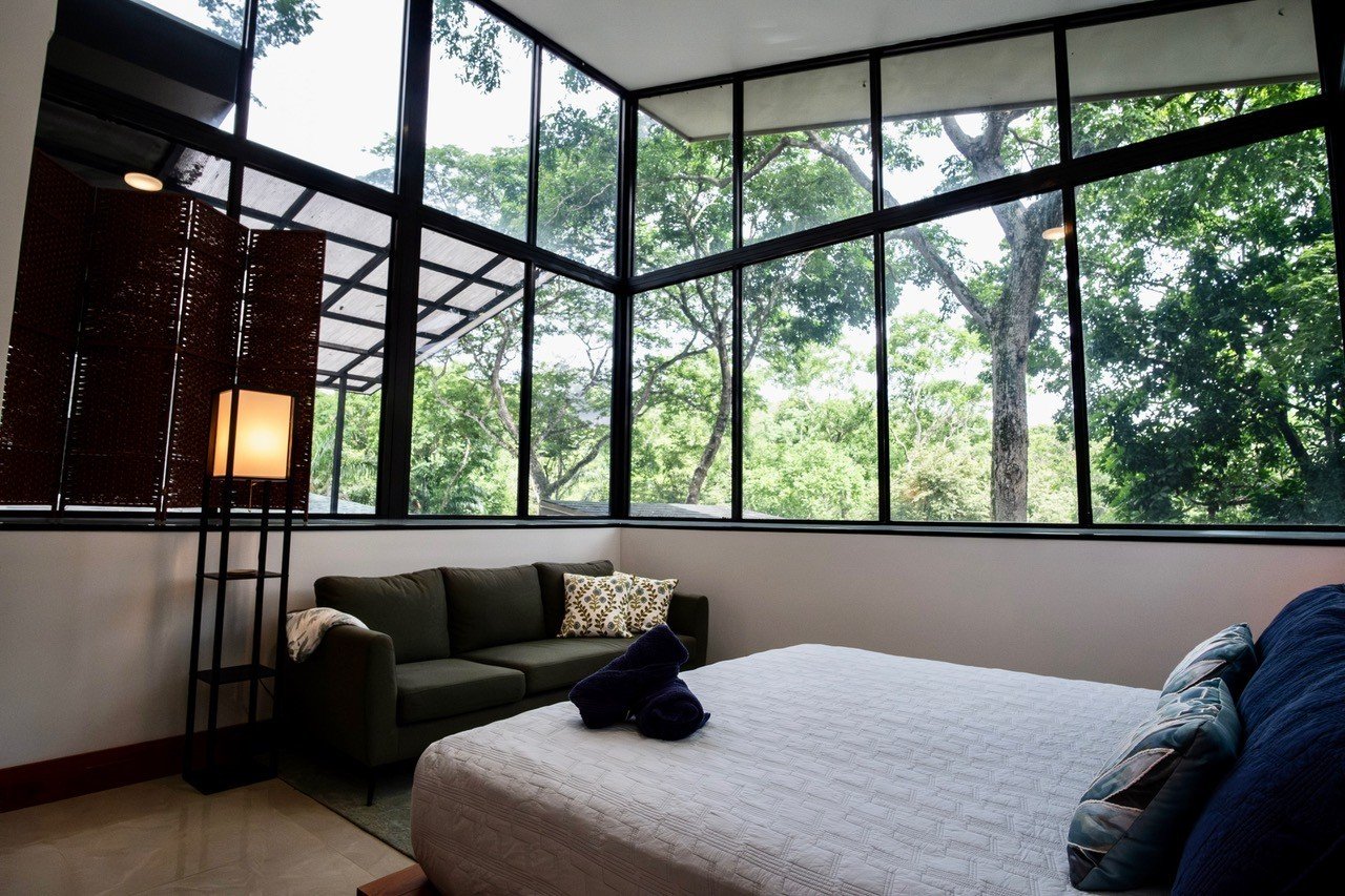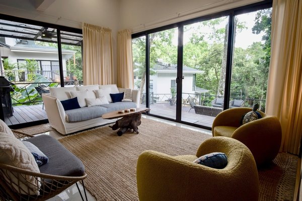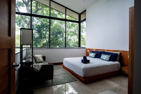 Casa Colina is a modern two story, three bedroom, three bathroom home featuring floor to ceiling glass that provides a treehouse experience set within the surrounding jungle canopy.