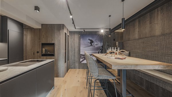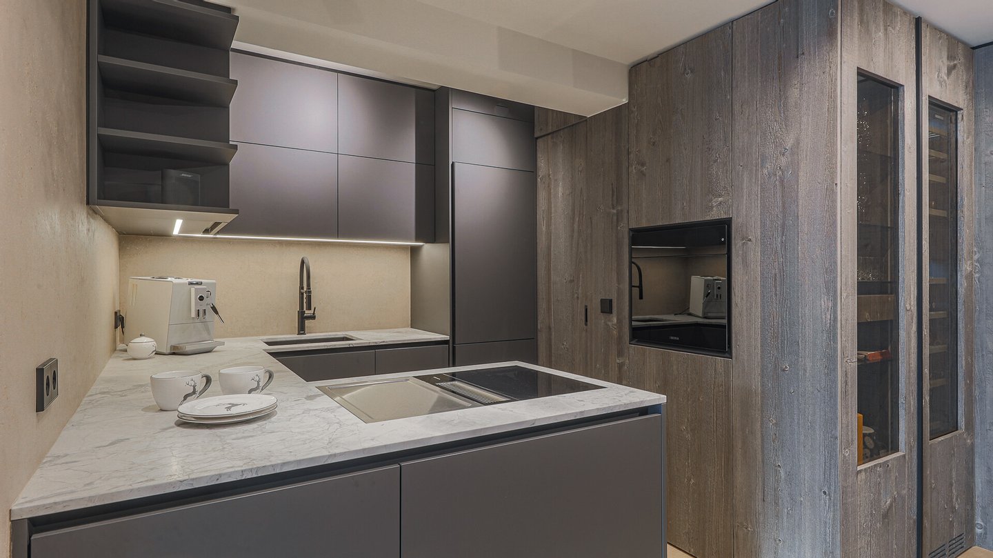 Über eine Glastüre gelangt man in den komfortablen Wohnbereich mit Glaskamin sowie die komplett eingerichtete Luxus-Küche mit Weinkühlschrank und Abstellraum, wo sich Waschmaschine und Trockner befinden. Im Bereich der Küche ist ein Essplatz für 6 Personen situiert.
