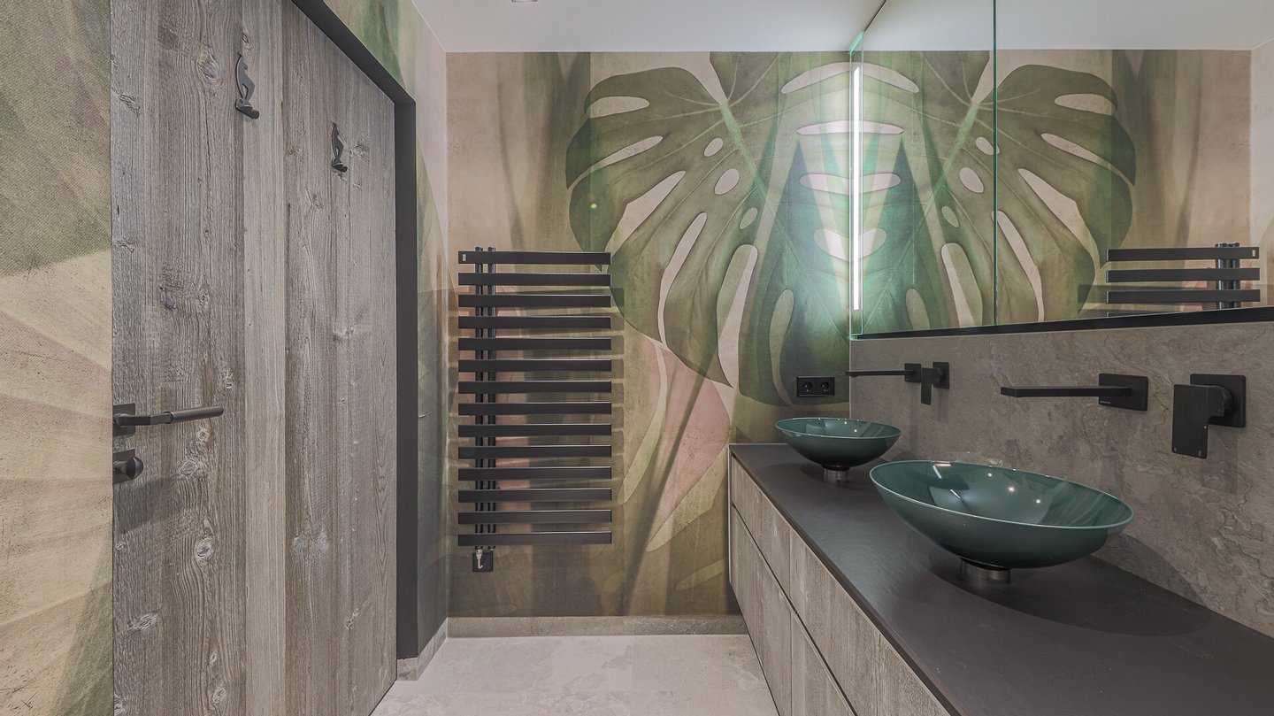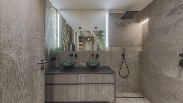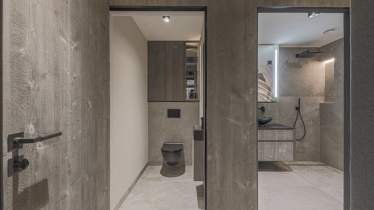 Mit dem Lift gelangt man in den 3. Stock und betritt die Diele. Hier befindet sich auch das Gäste-WC und in ein großzügiges Badezimmer mit Dusche und Doppelwaschbecken.