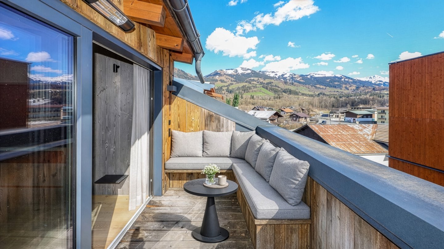Diese luxuriöse Penthouse-Maisonette liegt in fußläufiger Stadtlage und bietet einen schönen Ausblick auf die Bichlalm und richtung Südberge.