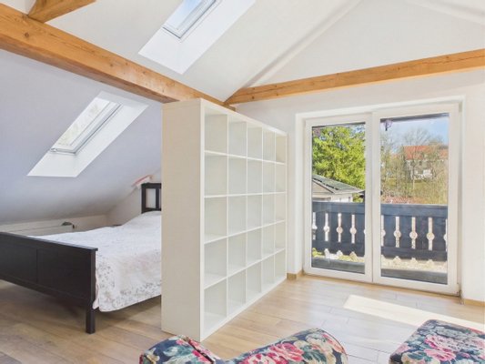 Dachgeschoss: Das 2013 ausgebaute Dachgeschoss bietet eine zusätzliche 2-Zimmer-Wohnung mit Studio, integrierter Küche und Kaminofen. Dank des offenen Treppenhauses lassen sich das Ober- und Dachgeschoss flexibel als eine sehr große, zusammenhängende Wohneinheit nutzen.