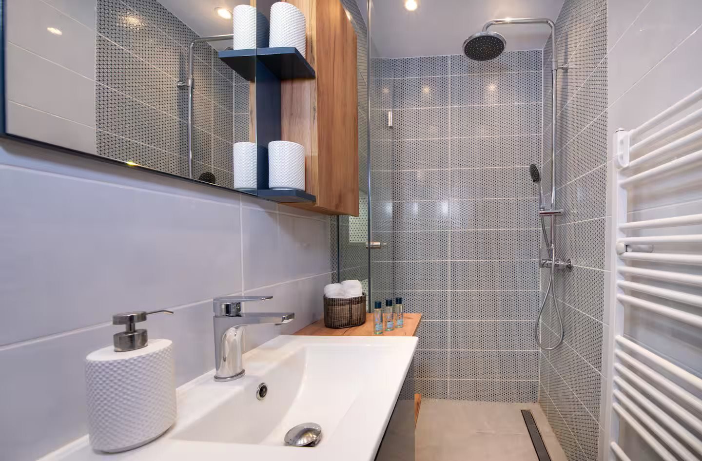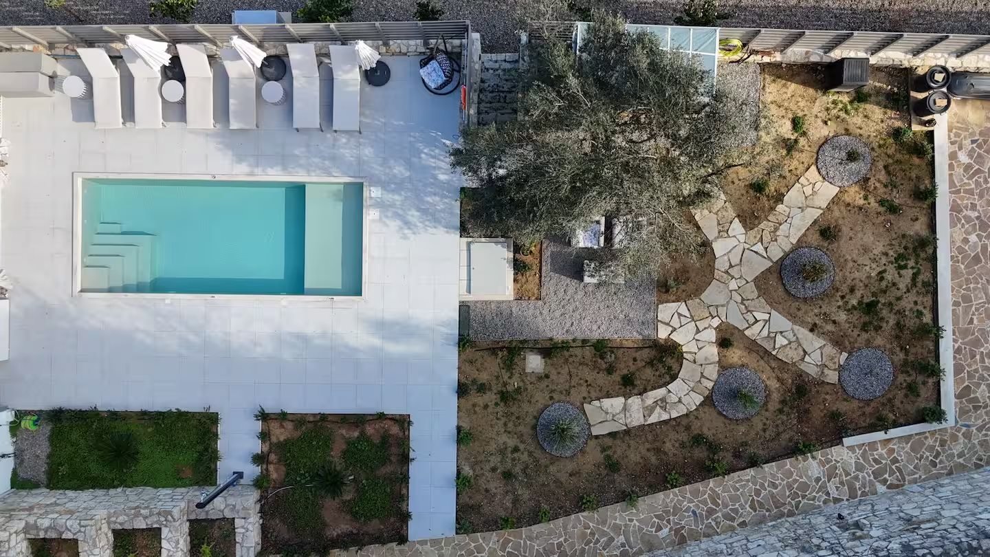 Unteres Erdgeschoss: Zwei gemütliche Schlafzimmer und ein zeitgenössisches Badezimmer befinden sich auf dieser Ebene. Jedes Schlafzimmer verfügt über Außentüren, die direkt in den Garten- und Poolbereich öffnen und so einen nahtlosen Indoor-Outdoorklima schaffen, ideal für den Sommergenuss.