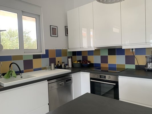 Haupthaus: Entworfen als eingeschossiges Gebäude, Sie betreten direkt den offenen Wohnbereich. Links befindet sich die vollständig eingerichtete Küche, der Essbereich liegt zur Seite.