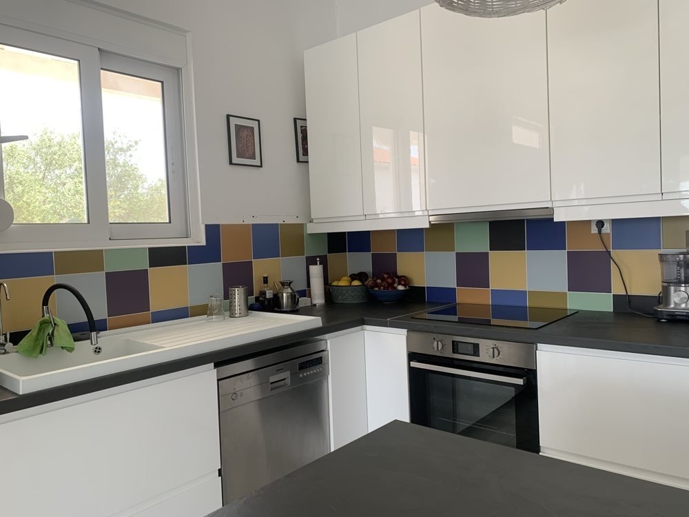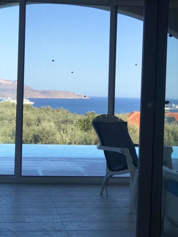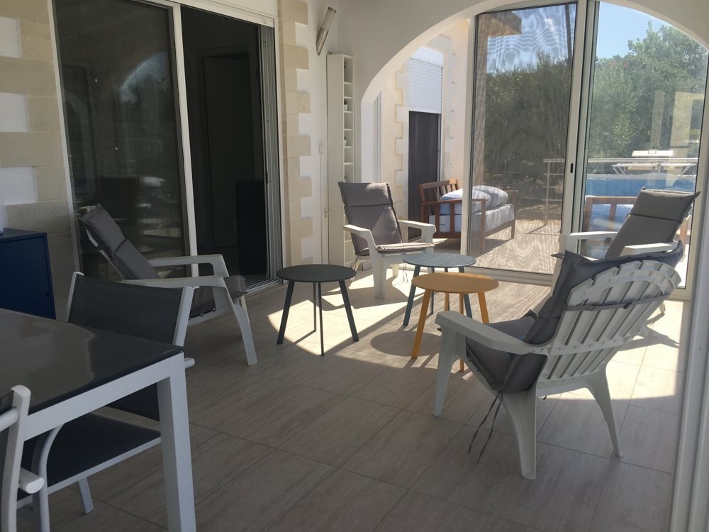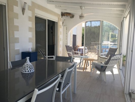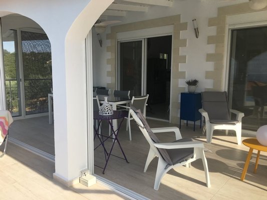 Die Winterlounge ist um den Kaminofen herum angeordnet. Die verglaste Veranda mit vollständig öffnenden Türen erstreckt sich über die Länge des Hauses und führt zum Pool und den Terrassen. Von hier genießen Sie den Blick über den Hang zum Meer – ideal zum Entertainen im Sommer.