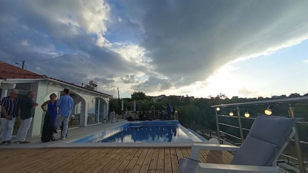 Im Erdgeschoss befindet sich der offene Wohnbereich mit eingerichteter Küche und WC mit Terrassentüren zu einer überdachten Terrasse am privaten Pool. Über eine Außentreppe gelangen Sie zum Schlafzimmer mit eigenem Bad und einer großen Terrasse.