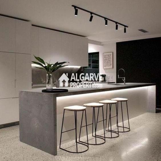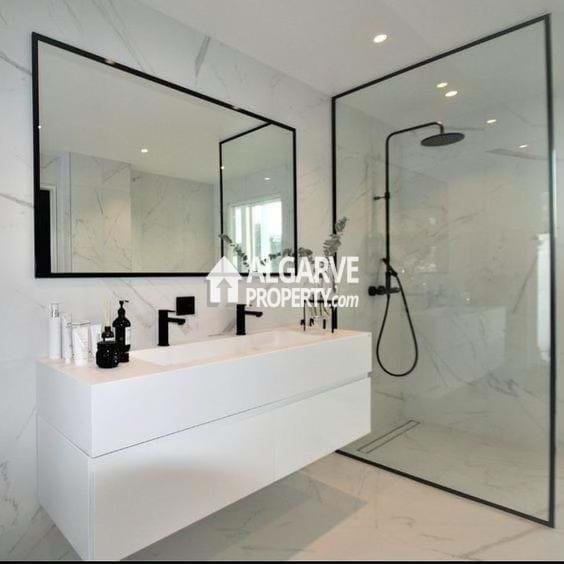 Mit gut bemessenen und klar strukturierten Bereichen erstreckt sich die Immobilie über das Erdgeschoss, das erste Obergeschoss und eine großzügige Dachterrasse, ideal, um das algarvierische Klima zu genießen. Die Villa verfügt über vier Schlafzimmer, eine funktionale Raumaufteilung, hervorragende natürliche Helligkeit und Komfort in allen Bereichen.