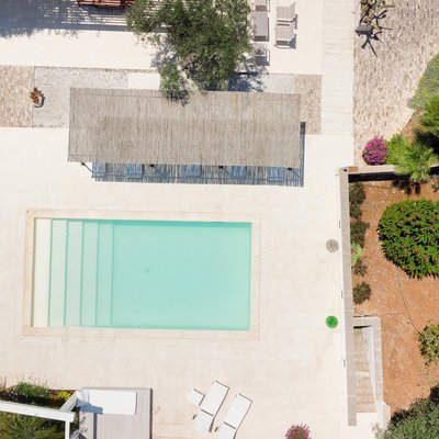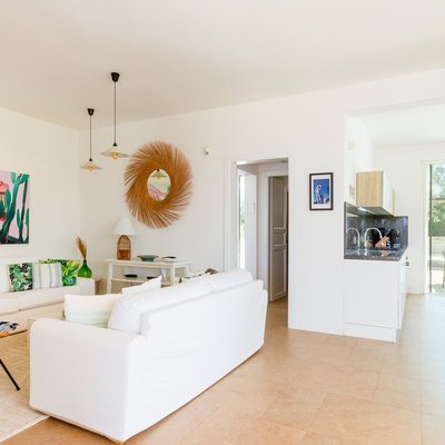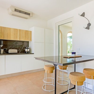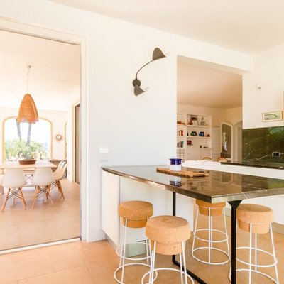 Stellen Sie sich Sommertage unter dem nach Süden ausgerichteten Portikus vor, wo jede Mahlzeit zu einem sensorischen Erlebnis wird, begleitet vom Gesang der Vögel und dem atemberaubenden Blick auf das Meer von der Terrasse. Die Abende verwandeln sich in süße Erinnerungen, mit einer Beleuchtung, die die Außenräume sanft umschmeichelt.