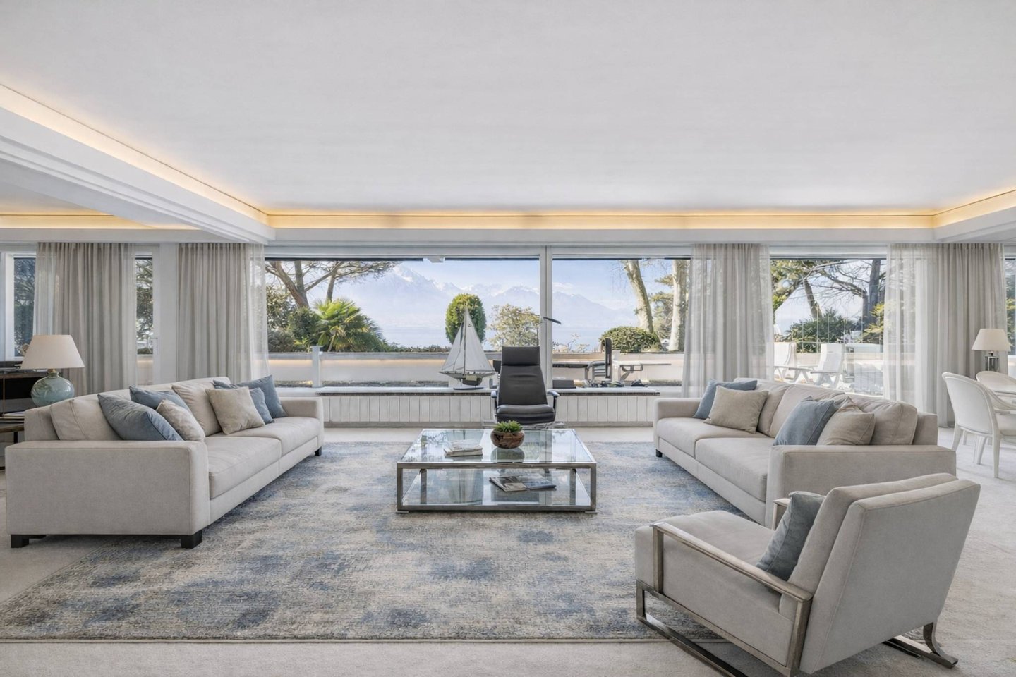 Die Wohnung befindet sich im ersten Stock und profitiert von einer breiten, zum See hin offenen Fassade sowie einer Terrasse von etwa 63 m², die sich über die gesamte Länge erstreckt und einen ungehinderten und dominanten Blick auf den Genfersee und die umliegenden Berge bietet.