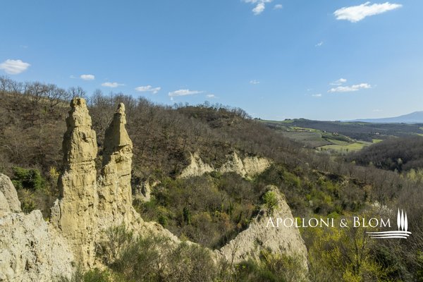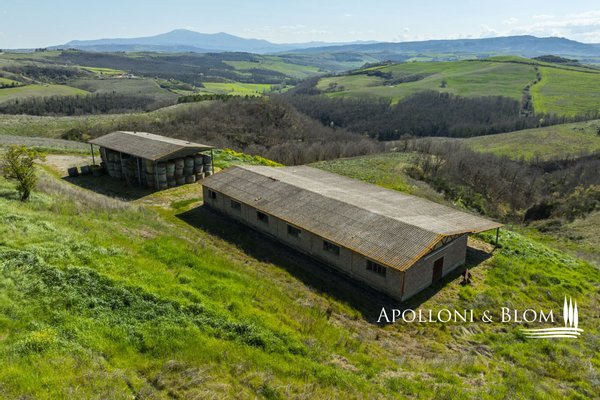 In Panoramalage, mit 126 Hektar Land, Komplex mit Bauernhäusern, Scheunen und Nebengebäuden in der Nähe von Montalcino zu verkaufen. Im authentischen Herzen des Val d'Orcia, nicht weit von Montalcino entfernt, befindet sich ein 126 Hektar großes