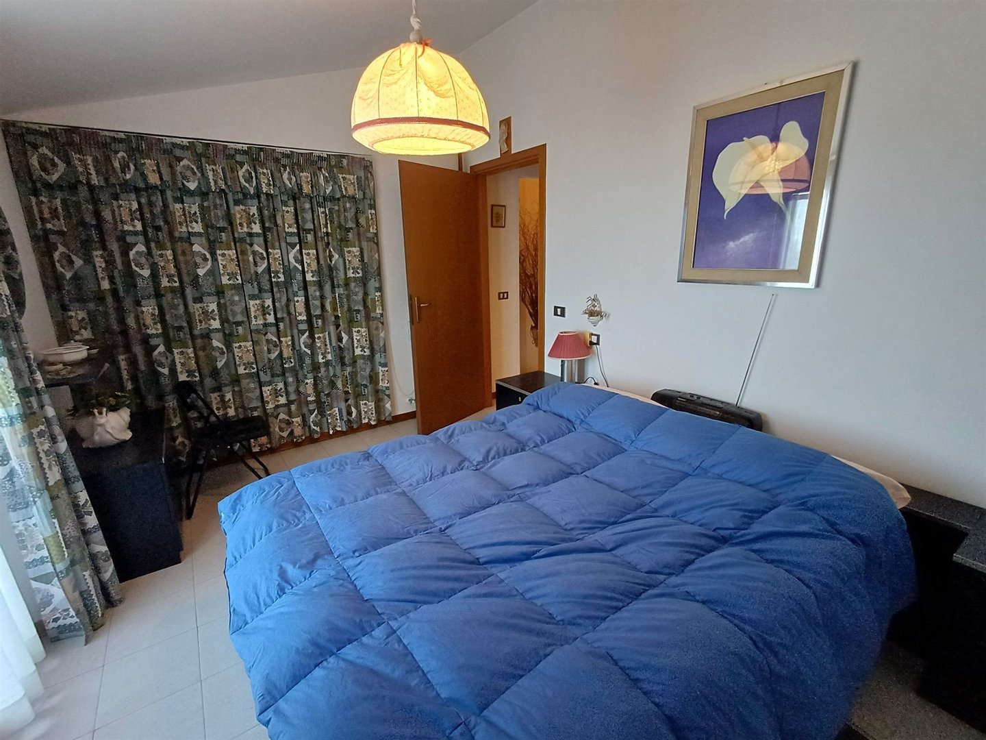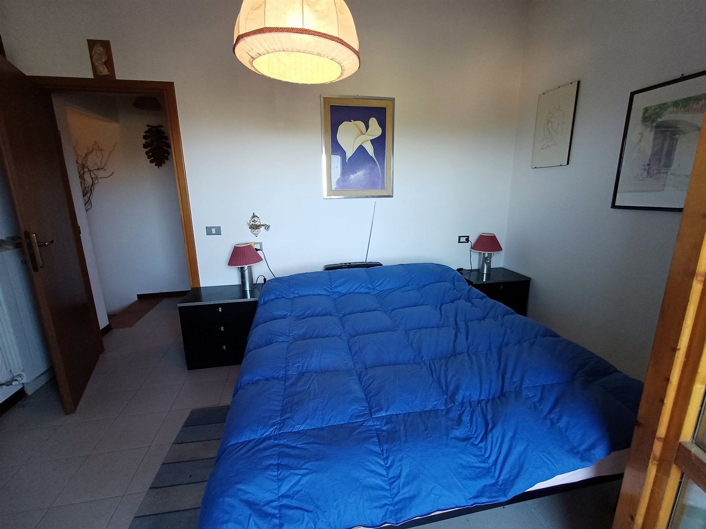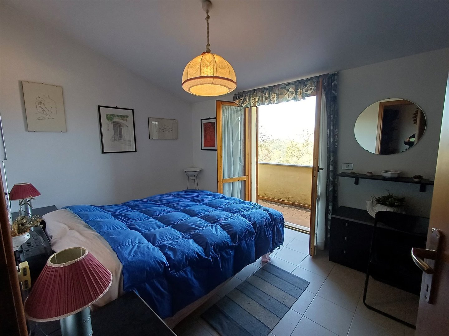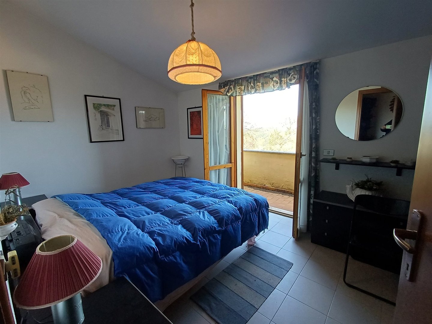 Der Schlafbereich beherbergt ein gut dimensioniertes Doppelzimmer mit einem panoramischen Balkon, der auf das umliegende Grün blickt. Das Stockwerk wird durch ein fensterloses, helles und funktionales Badezimmer vervollständigt.