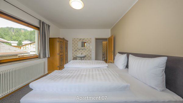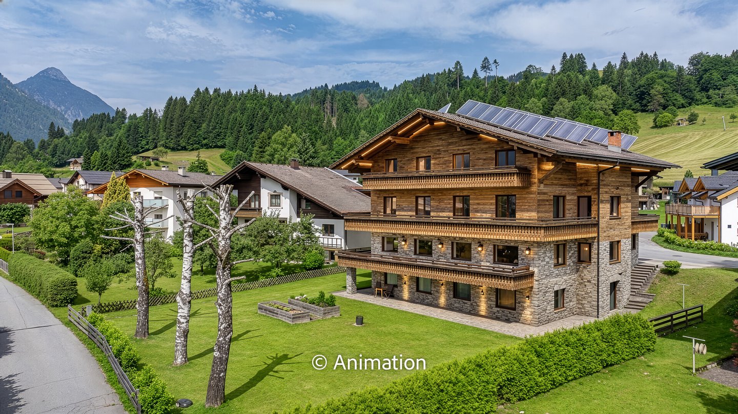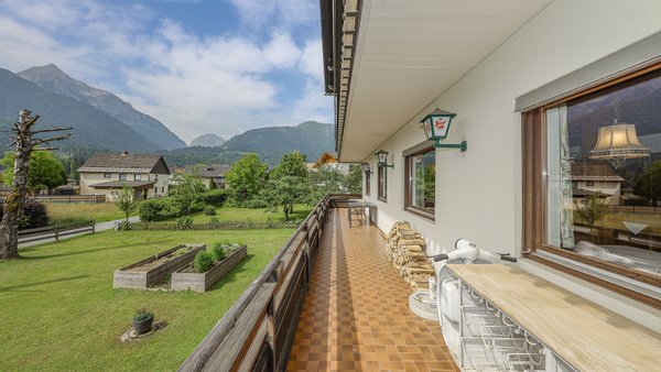 Das großzügige Stiegenhaus verbindet alle Geschosse miteinander. Im ersten Stock befinden sich die ersten Zimmer mit unterschiedlichen Größen und Ausstattung. Von jedem der Apartments gelangt man auf den großen Balkon, welcher einen weitläufigen Panoramablick auf die umliegenden Berge bietet.