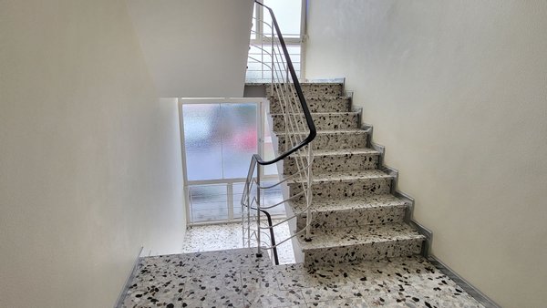 Die Fenster sind aus Holz mit Doppelverglasung, sie sind mit Außenjalousien ausgestattet und stammen aus den 70er Jahren. Die Balkone sind nach Süden und Norden ausgerichtet und haben Sichtschutzblenden. Das Haus ist überwiegend verklinkert und