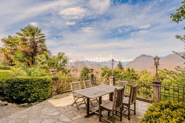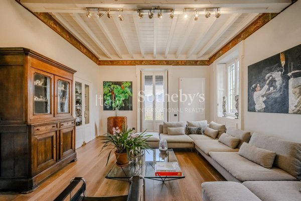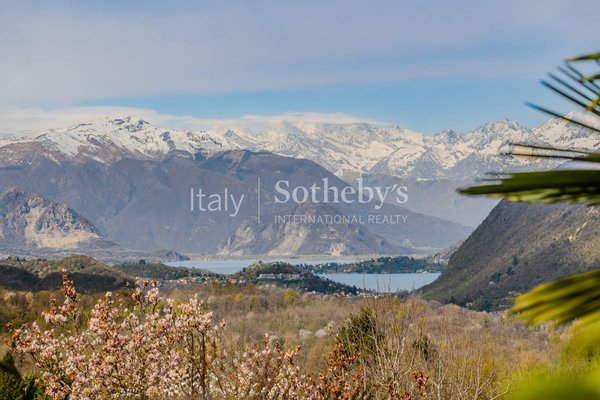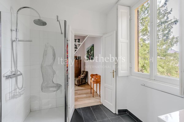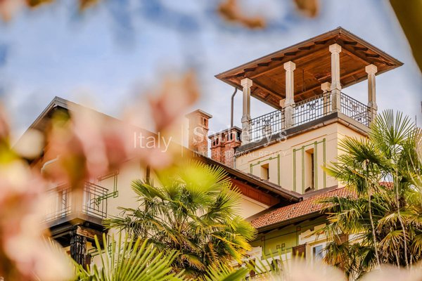 The property spans 344 square meters across four levels and is set within a 2,800 sqm park (30,139 sq.ft.), whose lush vegetation creates a fairytale atmosphere and provides unique views of Lake Maggiore and Monte Rosa. The renovation has enhanced the home's historic character, preserving original materials and architectural elements such as stone flooring, decorative cement tiles, and parquet, while integrating modern comforts.