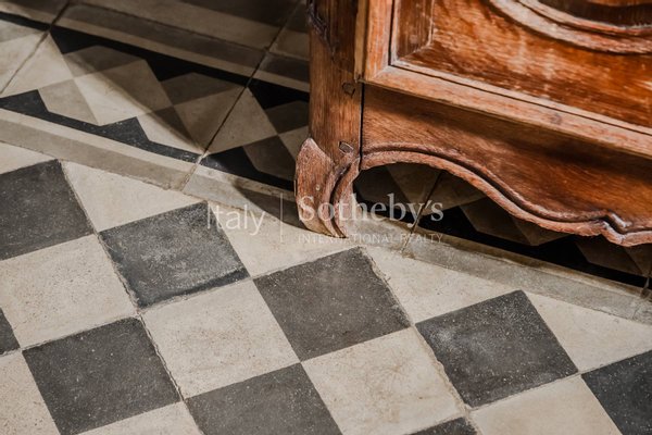 The interiors are spacious, bright, and thoughtfully laid out, offering elegance and warmth in every room. On the ground floor, a double living room, enhanced by two fireplaces, leads into a large eat-in kitchen equipped with seven burners and a double oven, alongside a guest bathroom. A striking stone staircase with its original wrought-iron balustrade leads to the upper floors. The first floor hosts the sleeping area, featuring three double bedrooms, a walk-in closet, and a master suite with an en suite bathroom and access to a panoramic terrace. Continuing to the second floor, there are two additional double bedrooms and an elegant bathroom featuring a freestanding cast-iron bathtub. Another staircase leads to the tower, culminating in a rooftop terrace (altana) that offers breathtaking views of the surrounding landscape. The basement level includes service areas such as a laundry room, fitness area, cellar, and technical rooms.