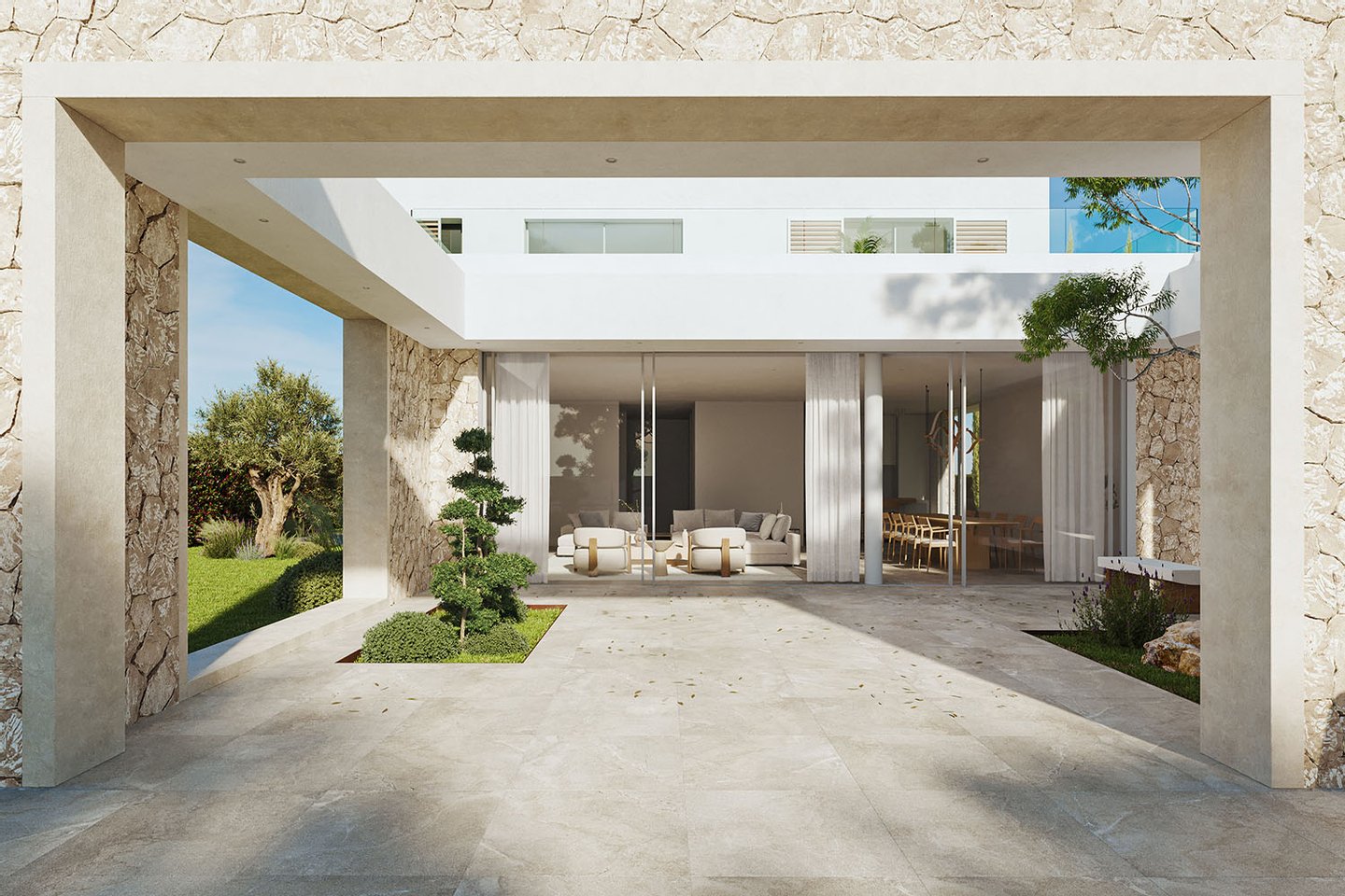 Bereits der Eingangsbereich beeindruckt mit einer harmonischen Gestaltung aus Naturstein und klaren Sichtachsen, eingebettet in eine gepflegte, mediterrane Gartenanlage. Im Außenbereich setzen mehrere Terrassen mit großzügigen, rahmenartigen Öffnungen architektonische Akzente und schaffen geschützte, gleichzeitig offene Aufenthaltsbereiche mit Blick ins Grüne und zum Pool.
