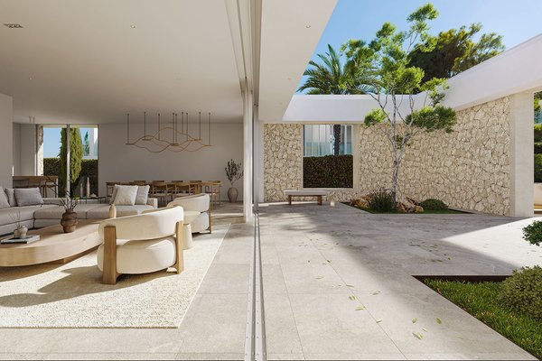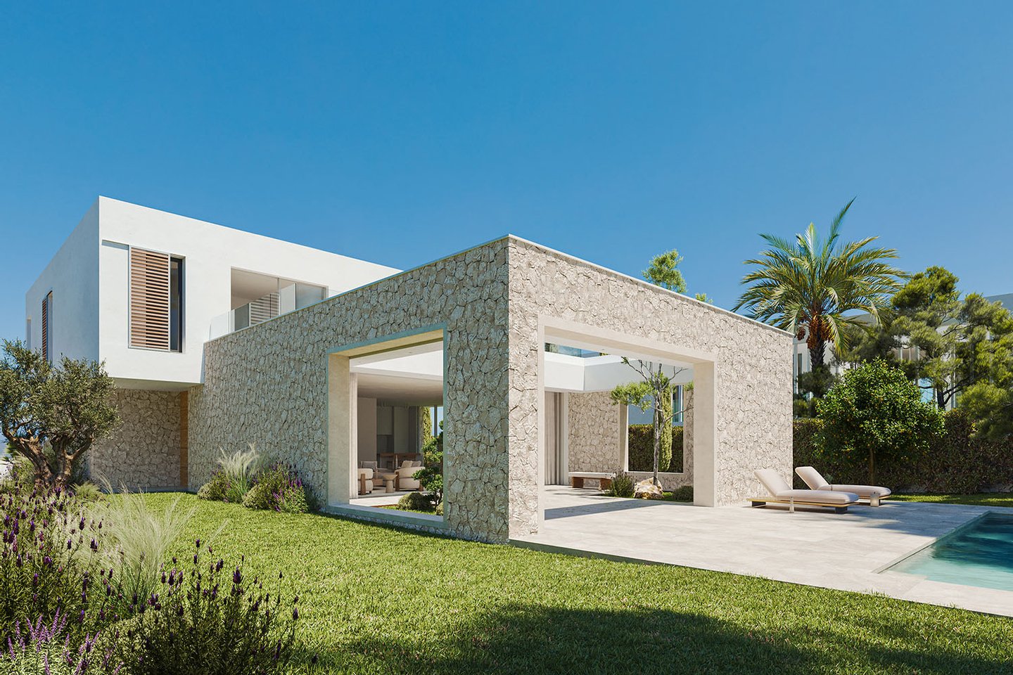 Diese hochwertige Villa ist Teil eines exklusiven Neubauprojekts von Designer-Villen mit geplanter Fertigstellung im Jahr 2027 und vereint moderne Architektur mit natürlichen Materialien und klaren Linien. Die Kombination aus hellen, kubischen Baukörpern und stilvollen Natursteinfassaden verleiht dem Anwesen eine zeitlose, elegante Ausstrahlung.