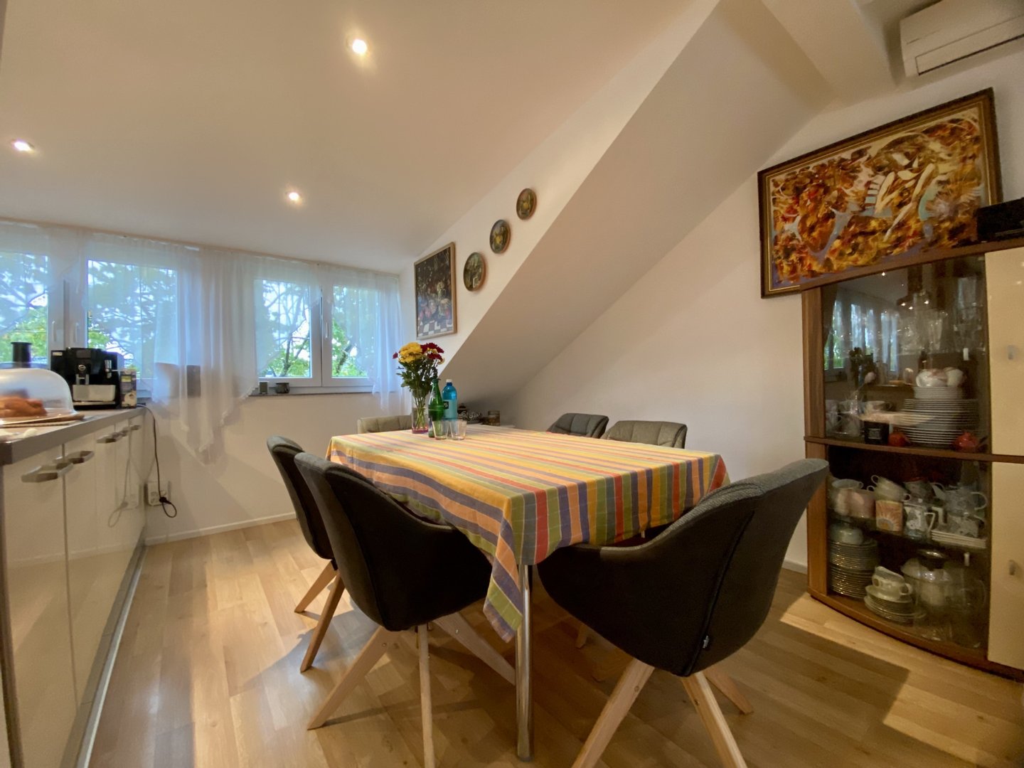 Der Bodenbelag besteht aus hochwertigen Fliesen und Vinylboden, die eine pflegeleichte und stilvolle Oberfläche bieten. Ein besonderes Highlight dieser Immobilie ist die vorhandene Klimaanlage, die für ein angenehmes Raumklima sorgt, unabhängig von der Jahreszeit.