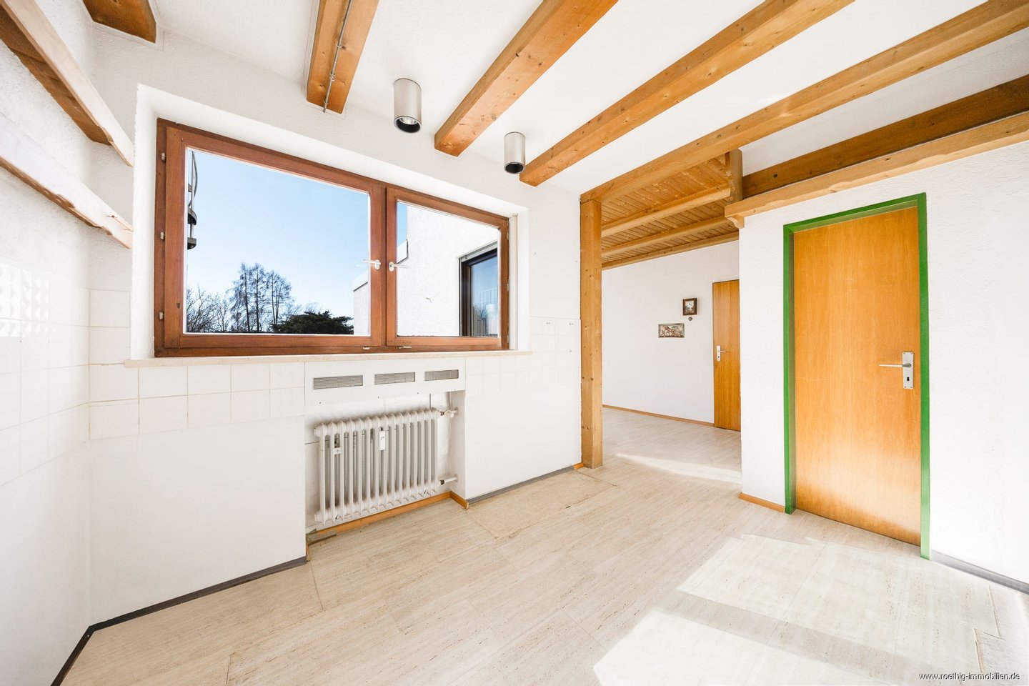 Die repräsentative Wohnküche mit beeindruckendem Panoramablick über den Garten & Platz für einen Esstisch, eröffnet vielseitige Möglichkeiten zur Gestaltung einer exklusiven Traumküche mit Speisekammer.