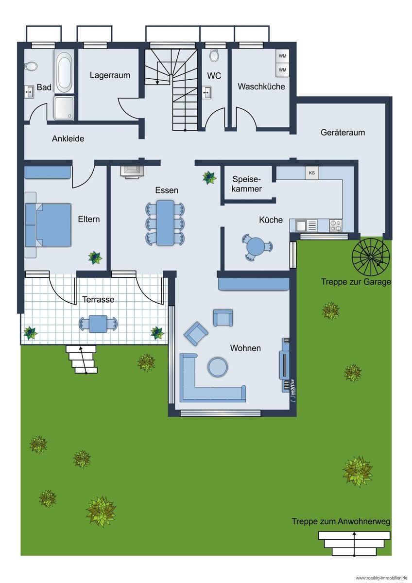 Ein Lagerraum, ein weiteres Gäste-WC sowie eine Waschküche ergänzen das Raumangebot dieser Etage sinnvoll und schaffen zusätzliche Stauraum- und Funktionsflächen.