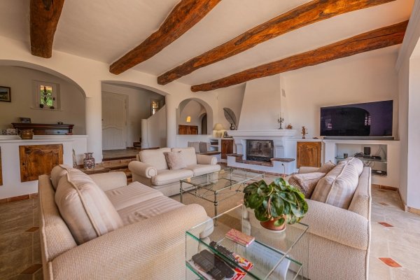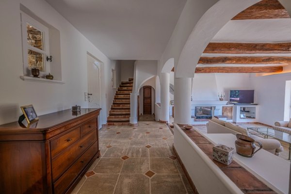 Hinter einer steinernen Veranda bietet das Haus ein helles Doppelwohnzimmer mit freiliegenden Balken, Kamin und Natursteinböden, die auf eine Terrasse mit Blick auf das Schwimmbecken und die Hügel hinausgeht.