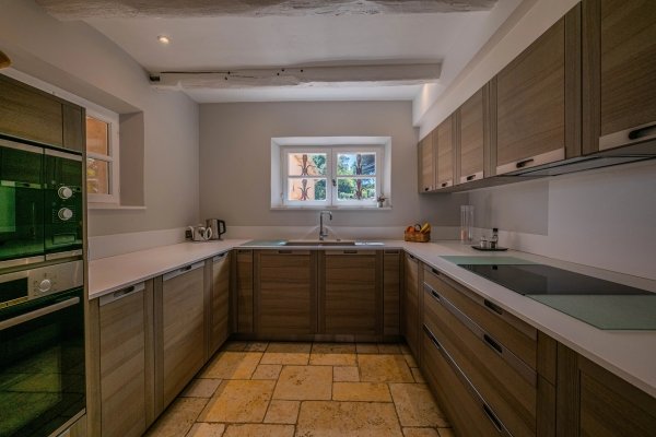 Die kürzlich renovierte separate Küche öffnet sich zu einer überdachten Terrasse mit Grillplatz.